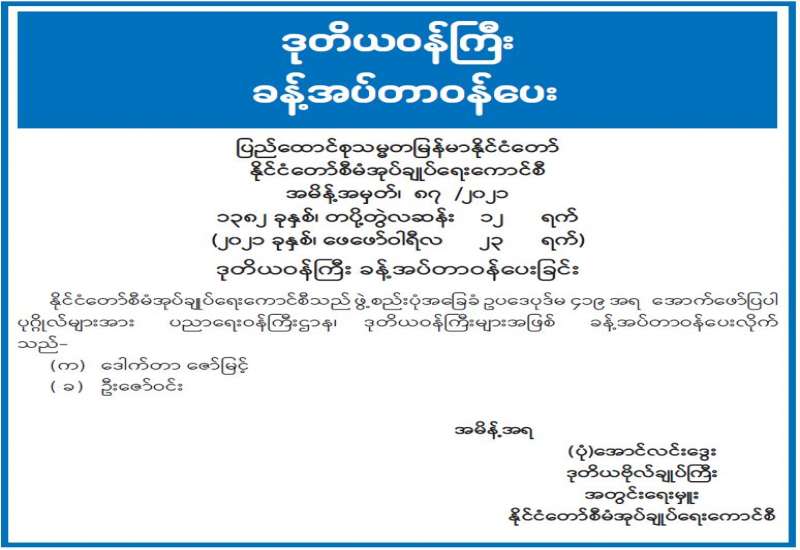 ပြည်ထောင်စုသမ္မတမြန်မာနိုင်ငံတော် နိုင်ငံတော်စီမံအုပ်ချုပ်ရေးကောင်စီ အမိန့်အမှတ်၊ ၈၄ /၂၀၂၁ ၁၃၈၂ ခုနှစ်၊ တပို့တွဲလဆန်း ၁၂ ရက် (၂၀၂၁ ခုနှစ်၊ ဖေဖော်ဝါရီလ ၂၃ ရက်) ဒုတိယဝန်ကြီး ခန့်အပ်တာဝန်ပေးခြင်း