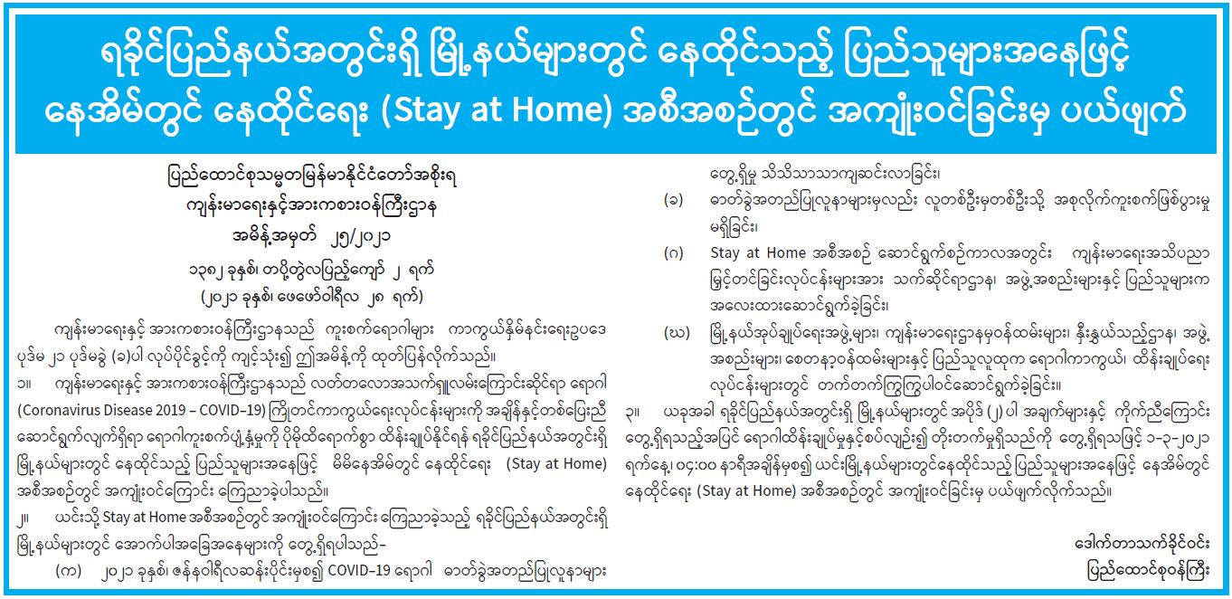 ရခိုင်ပြည်နယ်အတွင်းရှိ မြို့နယ်များတွင် နေထိုင်သည့် ပြည်သူများအနေဖြင့် နေအိမ်တွင် နေထိုင်ရေး (Stay at Home) အစီအစဉ်တွင် အကျုံးဝင်ခြင်းမှ ပယ်ဖျက်