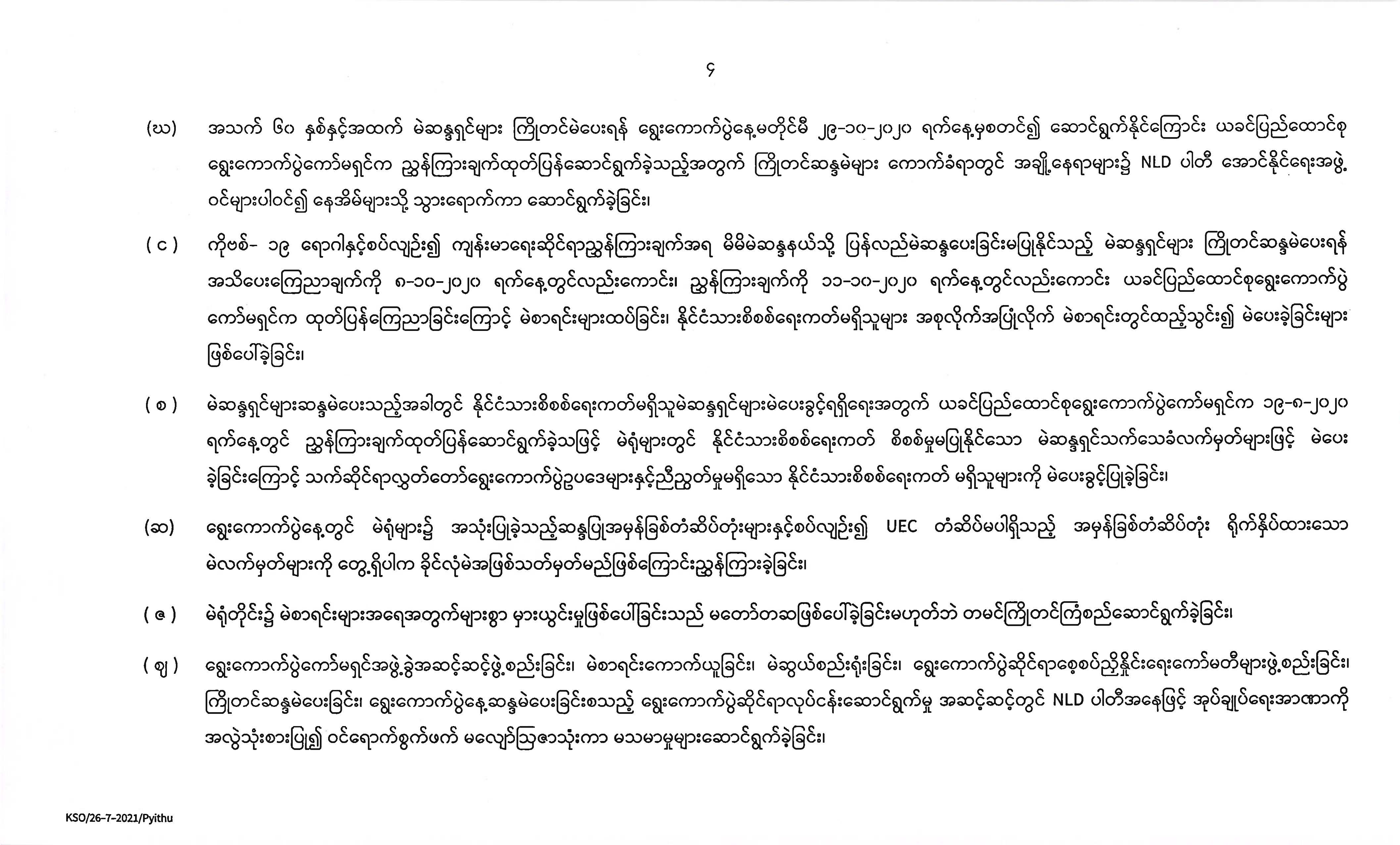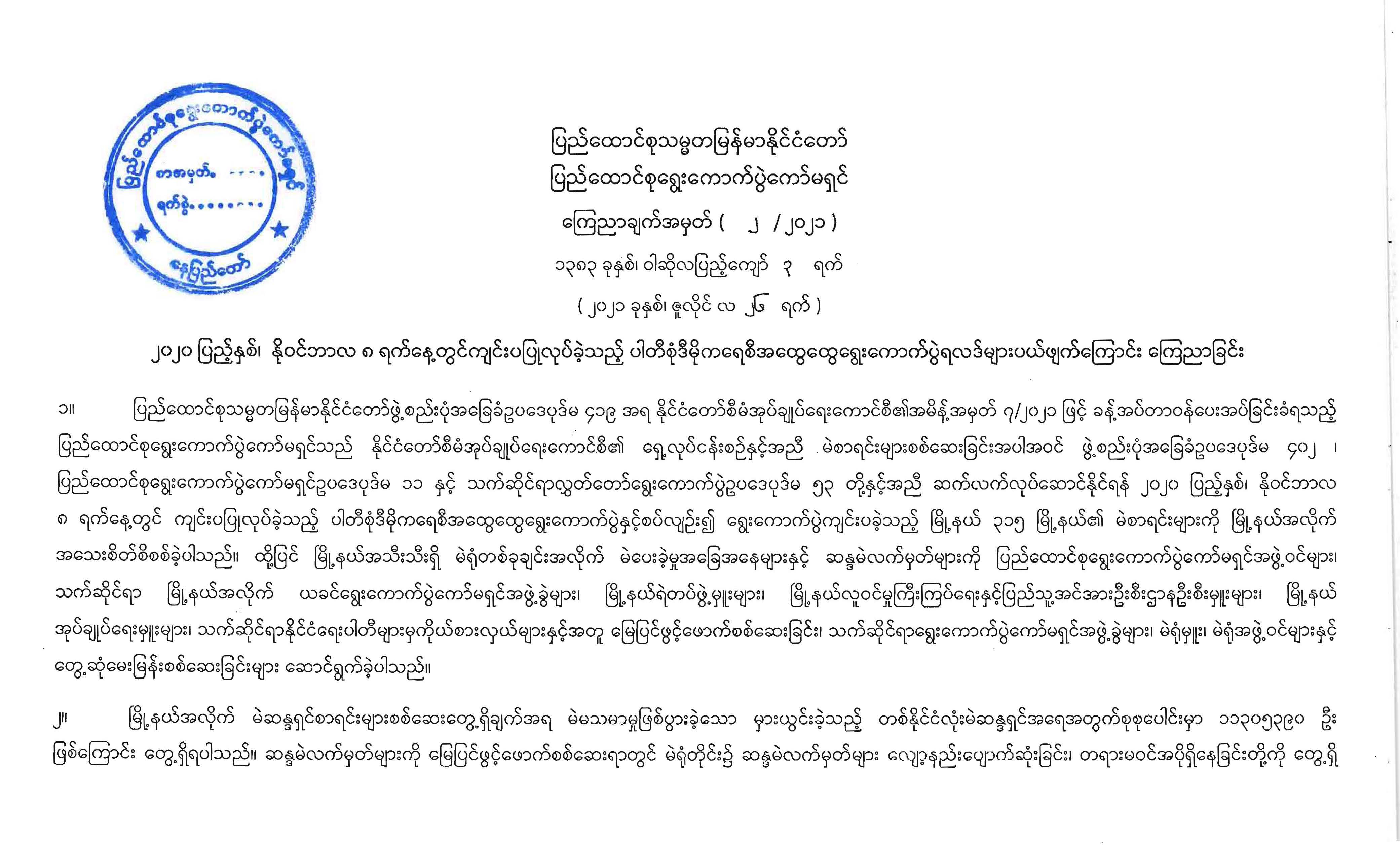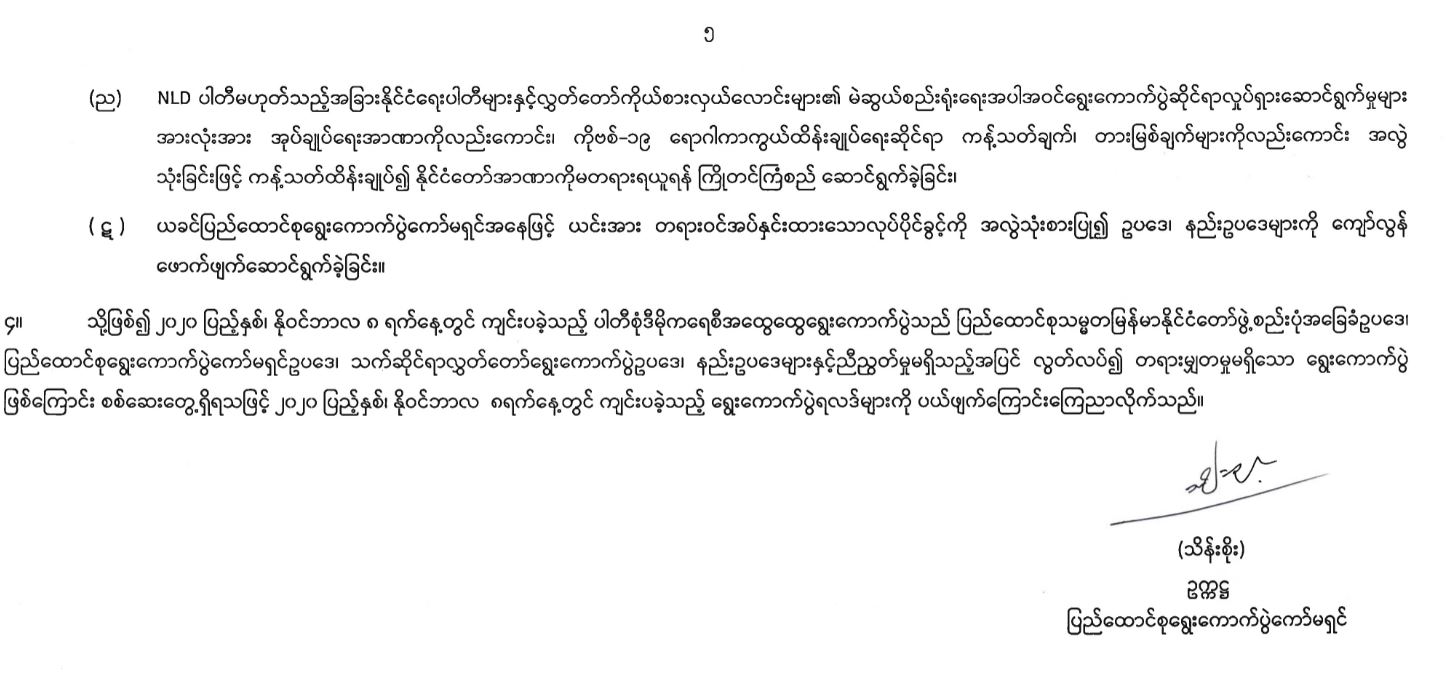 ၂၀၂၀ ပြည့်နှစ်၊ နိုဝင်ဘာလ ၈ ရက်နေ့တွင် ကျင်းပပြုလုပ်ခဲ့သည့် ပါတီစုံဒီမိုကရေစီအထွေထွေရွေးကောက်ပွဲရလဒ်များပယ်ဖျက်ကြောင်း ကြေညာခြင်း