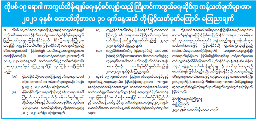 ကိုဗစ်-၁၉ရောဂါကာကွယ်ထိန်းချုပ်ရေးနှင့် စပ်လျဉ်းသည့် ကြိုတင်ကာကွယ်ရေးဆိုင်ရာ ကန့်သတ်ချက်များအား ၂၀၂၁ ခုနှစ်၊ အောက်တိုဘာလ ၃၁ ရက်နေ့အထိ တိုးမြှင့်သတ်မှတ်ကြောင်း ကြေညာချက်