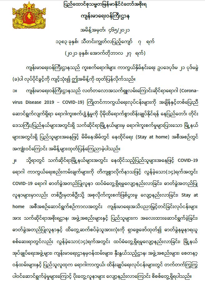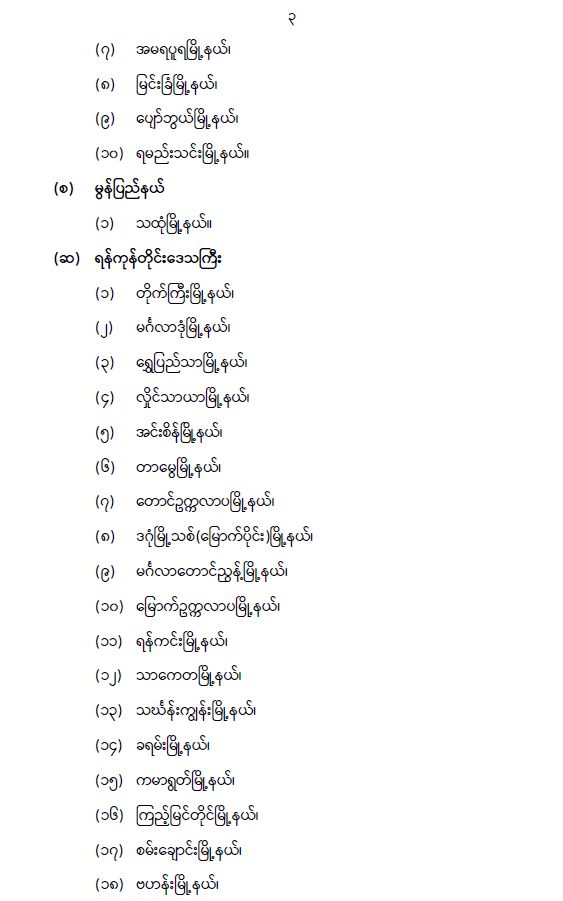 တိုင်းဒေသကြီး/ပြည်နယ်များအတွင်းရှိ ဖော်ပြပါ မြို့နယ် ၄၄ မြို့နယ်အား Stay at home အစီအစဉ်တွင် အကျုံးဝင်ခြင်းမှ ပယ်ဖျက်