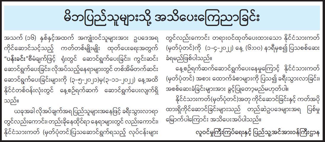 မိဘပြည်သူများသို့ အသိပေးကြေညာခြင်း
