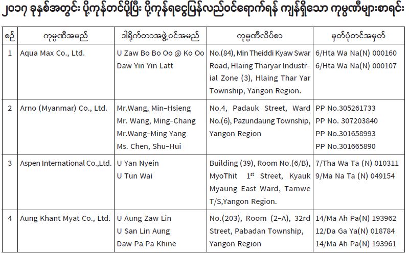 ၅။ အဆိုပါကုမ္ပဏီ(၁၅၈)ခု (ပူးတွဲစာရင်း) အား နိုင်ငံခြားသုံးငွေစီမံခန့်ခွဲမှုဥပဒေ ပုဒ်မ ၄၂-က အရ အရေးယူဆောင်ရွက်လျက်ရှိပြီး ကုမ္ပဏီများနှင့် ပူးတွဲဖော်ပြထားသည့် ကုမ္ပဏီများ၏ ဒါရိုက်တာအဖွဲ့ဝင်များအား အမည်မည်းစာရင်းထည့်သွင်းကြောင်းနှင့် ကျန်ရှိနေသေးသည့် ပို့ကုန်ရငွေဝင်ရောက်ရန် ကျန်ကုမ္ပဏီများအားလည်း အရေးယူဆောင်ရွက်ရန် ဆက်လက်စိစစ်လျက်ရှိကြောင်း ကြေညာပါသည်။
