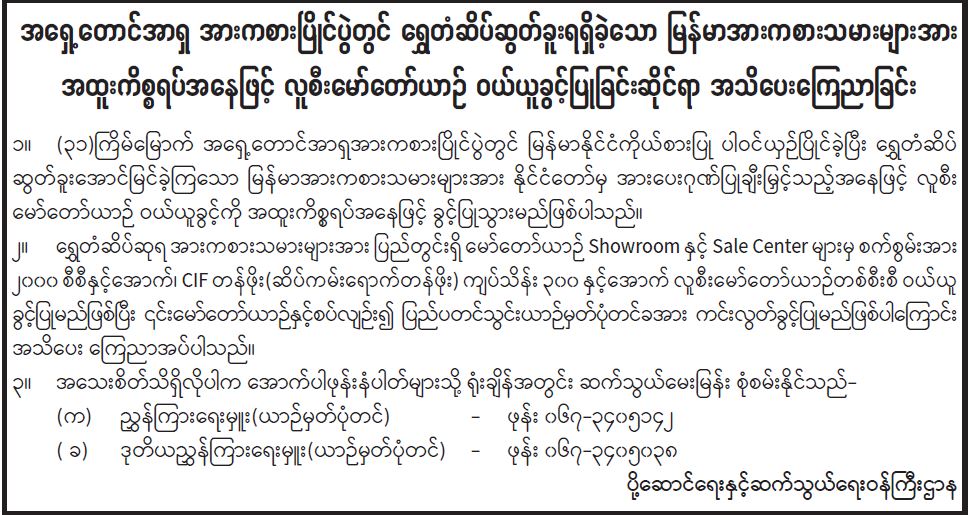အရှေ့တောင်အာရှအားကစားပြိုင်ပွဲတွင် ရွှေတံဆိပ်ဆွတ်ခူးရရှိခဲ့သော မြန်မာအားကစားသမားများအား အထူးကိစ္စရပ်အနေဖြင့် လူစီးမော်တော်ယာဉ် ဝယ်ယူခွင့်ပြုခြင်းဆိုင်ရာ အသိပေးကြေညာခြင်း