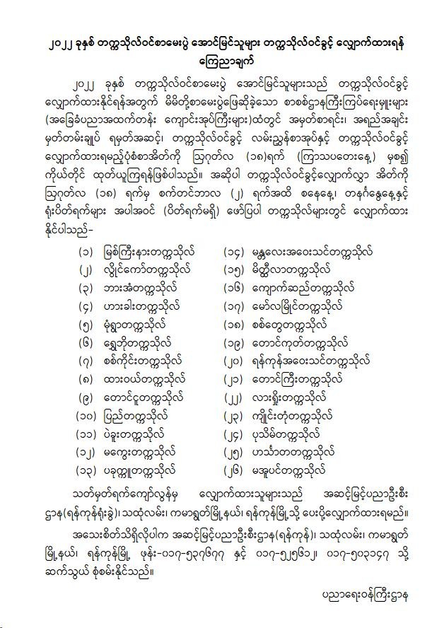 ၂၀၂၂ ခုနှစ် တက္ကသိုလ်ဝင်စာမေးပွဲ အောင်မြင်သူများ တက္ကသိုလ်ဝင်ခွင့် လျှောက်ထားရန် ကြေညာချက် 08/13/2022