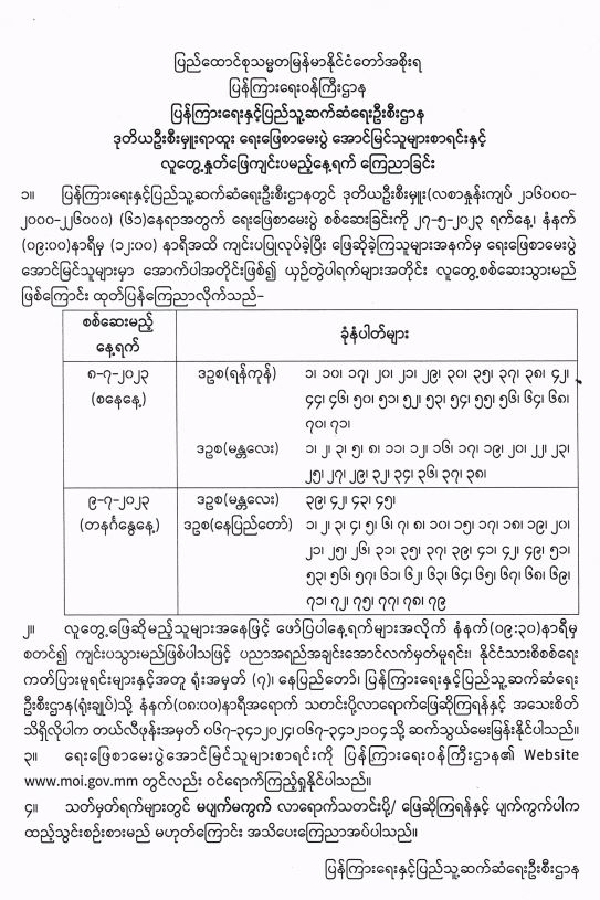 ပြန်ကြားရေးနှင့်ပြည်သူ့ဆက်ဆံရေးဦးစီးဌာန ဒုတိယဦးစီးမှူးရာထူး ရေးဖြေစာမေးပွဲ အောင်မြင်သူများစာရင်းနှင့် လူတွေ့နှုတ်ဖြေကျင်းပမည့်နေ့ရက် ကြေညာခြင်း 06/22/2023