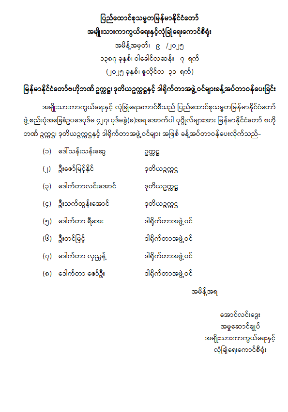 မြန်မာနိုင်ငံတော်ဗဟိုဘဏ် ဥက္ကဋ္ဌ၊ ဒုတိယဥက္ကဋ္ဌနှင့် ဒါရိုက်တာအဖွဲ့ဝင်များ ခန့်အပ်တာဝန်ပေးခြင်း