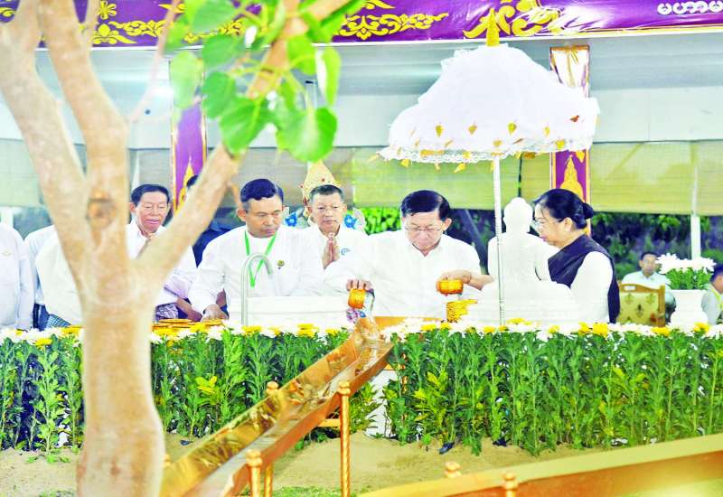 ဗုဒ္ဓဘာသာမြန်မာလူမျိုးတို့၏ ၁၂ လရာသီပွဲတော်တွင် တစ်ခုအပါအဝင်ဖြစ်သည့် မြန်မာသက္ကရာဇ် ၁၃၈၇ ခုနှစ်၊ ကဆုန်လပြည့်(ဗုဒ္ဓနေ့)ဖြစ်သော ယနေ့တွင် ကျရောက်သည့် ကဆုန်ညောင်ရေ သွန်းပွဲတော်တွင်ပြည်ထောင်စုနယ်မြေ နေပြည်တော် မာရဝိဇယဗုဒ္ဓဥယျာဉ် ပရိဝုဏ်တော်အတွင်းရှိ မဟာဗောဓိညောင်ပင်တော်အား ကဆုန်ညောင်ရေသွန်းလောင်းပူဇော်ခြင်း မင်္ဂလာအခမ်းအနားကို ယနေ့ညနေပိုင်းက ကျင်းပပြုလုပ်ရာ နိုင်ငံတော်စီမံအုပ်ချုပ်ရေးကောင်စီဥက္ကဋ္ဌ နိုင်ငံတော်ဝန်ကြီးချုပ် ဗိုလ်ချုပ်မှူးကြီးမင်းအောင်လှိုင်နှင့်ဇနီး ဒေါ်ကြူကြူလှတို့က မဟာဗောဓိညောင်ပင်တော်ကို ညောင်ရေသွန်းလောင်းပူဇော်ကြသည်။