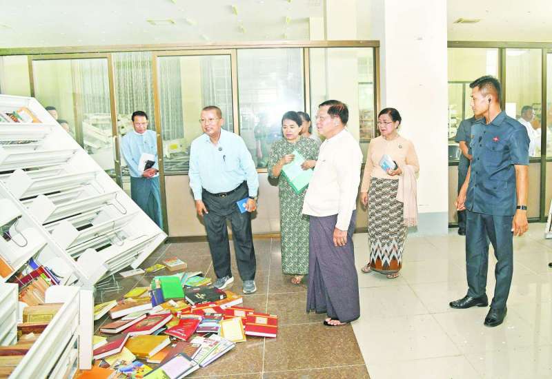 နိုင်ငံတော်စီမံအုပ်ချုပ်ရေးကောင်စီဥက္ကဋ္ဌ နိုင်ငံတော်ဝန်ကြီးချုပ် ဗိုလ်ချုပ်မှူးကြီး မင်းအောင်လှိုင်သည် ကောင်စီတွဲဖက်အတွင်းရေးမှူး ဗိုလ်ချုပ်ကြီး ရဲဝင်းဦး၊ ပြည်ထောင်စု ဝန်ကြီးများ၊ နေပြည်တော်ကောင်စီဥက္ကဋ္ဌနှင့်အဖွဲ့ဝင်များလိုက်ပါ၍ ယနေ့ နေ့လယ်ပိုင်းတွင် မန္တလေးငလျင်ကြီးကြောင့် ထိခိုက်ပျက်စီးမှုများဖြစ်ပေါ်ခဲ့သည့် အမျိုးသားစာကြည့်တိုက် (နေပြည်တော်)သို့ သွားရောက်ကြည့်ရှုစစ်ဆေးပြီး လိုအပ်သည်များ လမ်းညွှန်မှာကြားသည်။