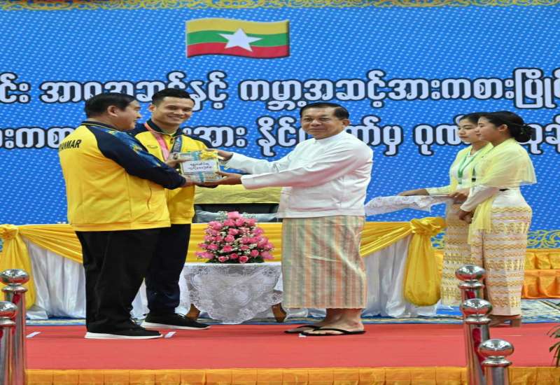 ၂၀၂၃ ခုနှစ်အတွင်း အာရှအဆင့်နှင့် ကမ္ဘာ့အဆင့်အားကစားပြိုင်ပွဲများတွင် ဆုတံဆိပ်ရရှိခဲ့သည့် မြန်မာအားကစားအဖွဲ့များအား နိုင်ငံတော်ကဂုဏ်ပြုဆုချီးမြှင့်သည့် အခမ်းအနားကို ယနေ့နံနက်ပိုင်းတွင် နေပြည်တော်ရှိ ဝဏ္ဏသိဒ္ဓိအားကစားရုံ (B) ၌ ကျင်းပရာ နိုင်ငံတော်စီမံအုပ်ချုပ်ရေးကောင်စီဥက္ကဋ္ဌ နိုင်ငံတော်ဝန်ကြီးချုပ် ဗိုလ်ချုပ်မှူးကြီး မင်းအောင်လှိုင် တက်ရောက်အမှာစကားပြောကြားပြီး ဂုဏ်ပြုဆုများပေးအပ်ချီးမြှင့်သည်။