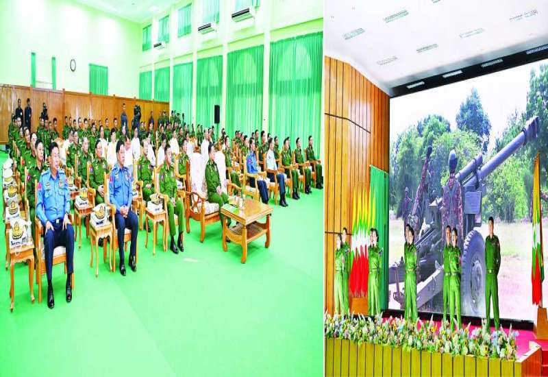 (၇၅) နှစ်မြောက် စိန်ရတုအမြောက်တပ်ဖွဲ့နေ့ အခမ်းအနားကို ယနေ့နံနက်ပိုင်းတွင် နေပြည်တော်၊ စစ်ကြောရေးနှင့် တည်းခိုရေးစခန်းရှိ ဆင်ဖြူရှင်ခန်းမ၌ ကျင်းပပြုလုပ်ရာ နိုင်ငံတော်စီမံအုပ်ချုပ်ရေးကောင်စီဥက္ကဋ္ဌ တပ်မတော်ကာကွယ်ရေး ဦးစီးချုပ် ဗိုလ်ချုပ်မှူးကြီး မင်းအောင်လှိုင် တက်ရောက်ချီးမြှင့်သည်။