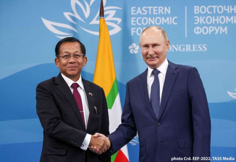 (၇) ကြိမ်မြောက် အရှေ့ဖျားစီးပွားရေးဖိုရမ် (The 7th Eastern Economic Forum -2022) သို့တက်ရောက်ရန် ရုရှားဖက်ဒရေးရှင်းနိုင်ငံသို့ ရောက်ရှိနေသည့် နိုင်ငံတော် စီမံအုပ်ချုပ်ရေးကောင်စီဥက္ကဋ္ဌ နိုင်ငံတော်ဝန်ကြီးချုပ် ဗိုလ်ချုပ်မှူးကြီး မင်းအောင်လှိုင်သည် ရုရှားဖက်ဒရေးရှင်းနိုင်ငံသမ္မတ H.E. Vladimir Vladimirovich Putin နှင့် ယနေ့ဒေသစံတော်ချိန် မွန်းလွဲပိုင်းတွင် ဗလာဒီဗော့စတော့ခ်မြို့၊ FEFU Campus အတွင်း၌ တွေ့ဆုံဆွေးနွေးသည်။