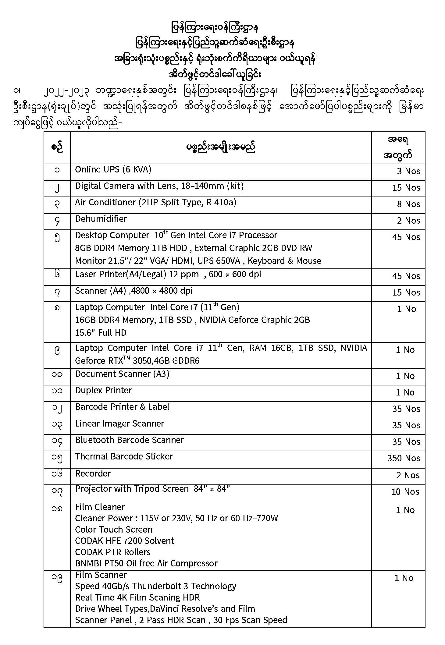 အခြားရုံးသုံးပစ္စည်းနှင့် ရုံးသုံးစက်ကိရိယာများ ဝယ်ယူရန် အိတ်ဖွင့်တင်ဒါခေါ်ယူခြင်း