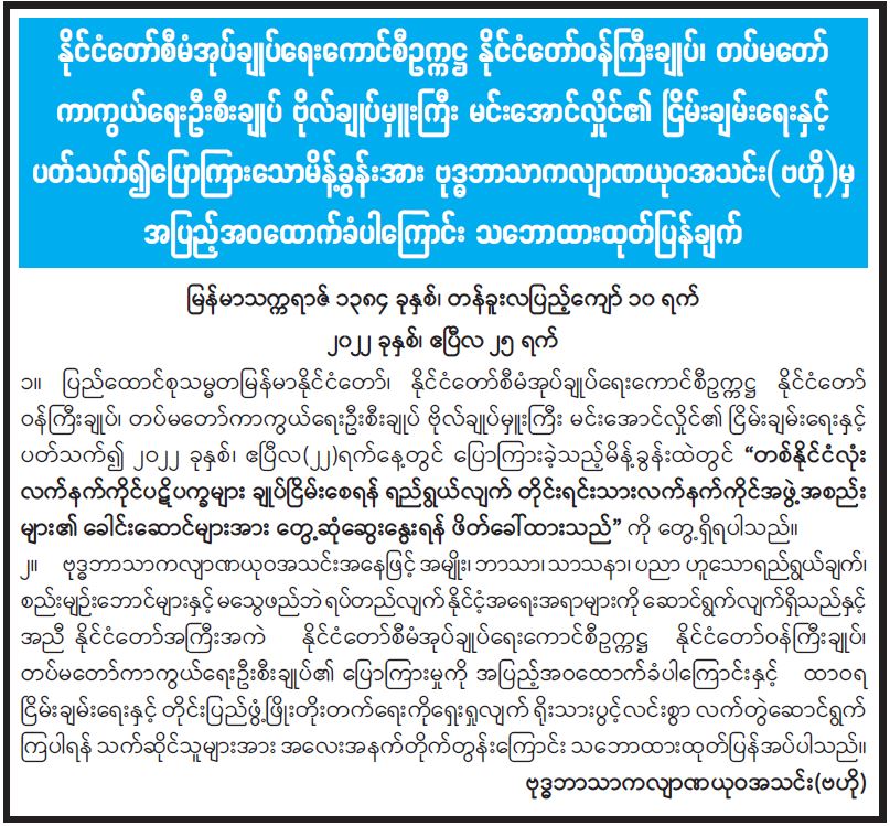 နိုင်ငံတော်စီမံအုပ်ချုပ်ရေးကောင်စီဥက္ကဋ္ဌ နိုင်ငံတော်ဝန်ကြီးချုပ်၊ တပ်မတော်ကာကွယ်ရေး ဦးစီးချုပ် ဗိုလ်ချုပ်မှူးကြီး မင်းအောင်လှိုင်၏ ငြိမ်းချမ်းရေးနှင့်ပတ်သက်၍ ပြောကြားသော မိန့်ခွန်းအား ဗုဒ္ဓဘာသာကလျာဏယုဝအသင်း(ဗဟို)မှ အပြည့်အဝထောက်ခံပါကြောင်း သဘောထားထုတ်ပြန်ချက်