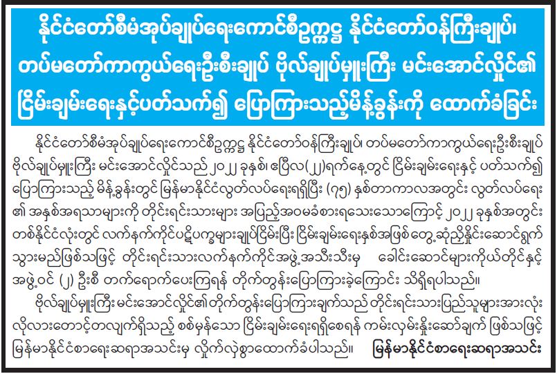 နိုင်ငံတော်စီမံအုပ်ချုပ်ရေးကောင်စီဥက္ကဋ္ဌ နိုင်ငံတော်ဝန်ကြီးချုပ်၊ တပ်မတော်ကာကွယ်ရေး ဦးစီးချုပ် ဗိုလ်ချုပ်မှူးကြီး မင်းအောင်လှိုင်၏ ငြိမ်းချမ်းရေးနှင့်ပတ်သက်၍ ပြောကြားချက်များအပေါ် မြန်မာနိုင်ငံ စာရေးဆရာအသင်းက လှိုက်လှဲစွာထောက်ခံ
