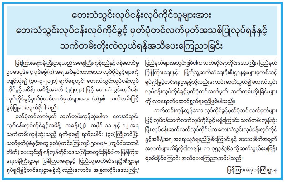 တေးသံသွင်းလုပ်ငန်းလုပ်ကိုင်သူများအား တေးသံသွင်းလုပ်ငန်းလုပ်ကိုင်ခွင့် မှတ်ပုံတင်လက်မှတ်အသစ်ပြုလုပ်ရန်နှင့် သက်တမ်းတိုးလဲလှယ်ရန် အသိပေးကြေညာခြင်း