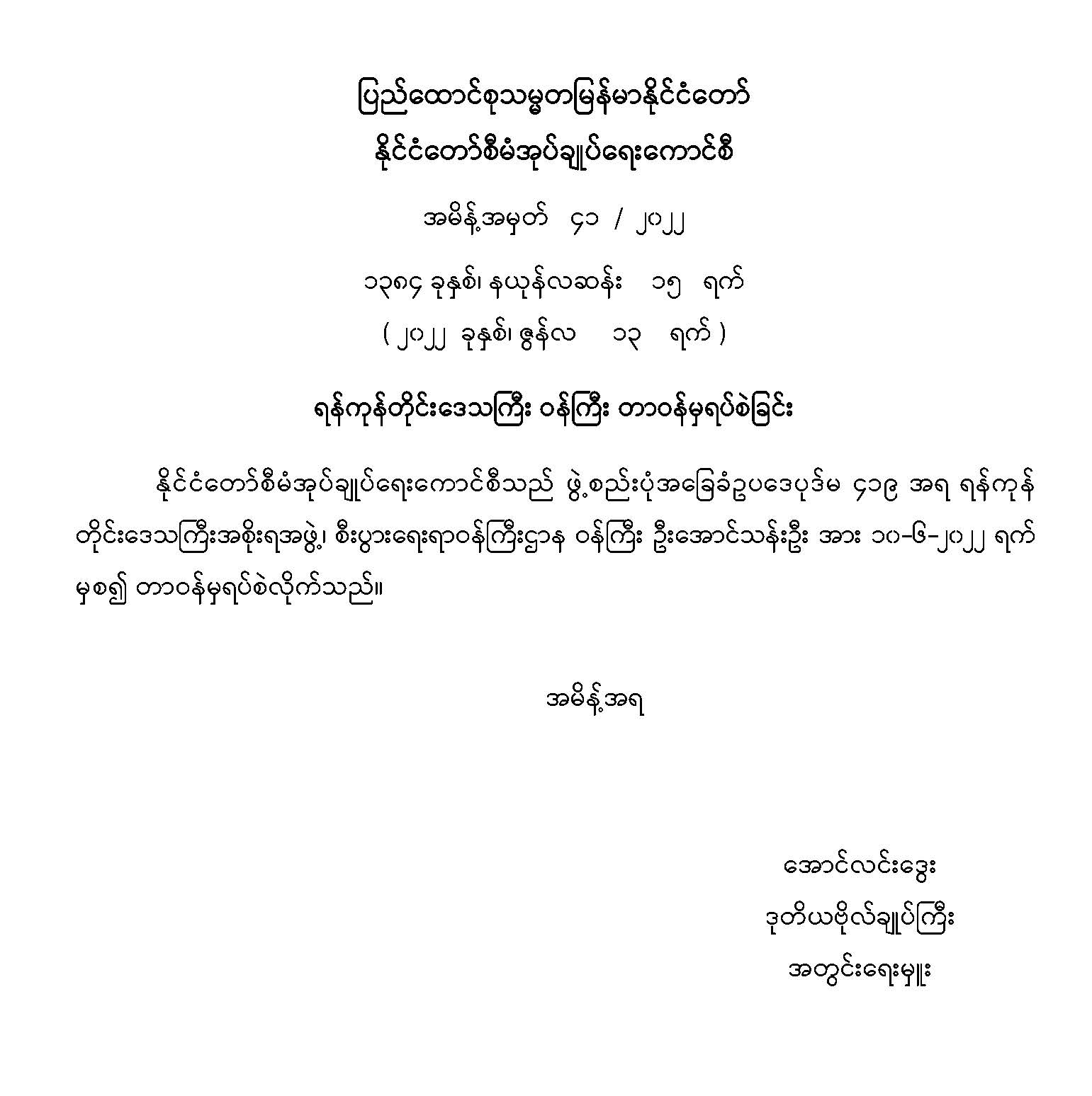 တိုင်းဒေသကြီးအစိုးရအဖွဲ့၊ စီးပွားရေးရာဝန်ကြီးဌာန ဝန်ကြီး ဦးအောင်သန်းဦး အား ၁၀-၆-၂၀၂၂ ရက် မှစ၍ တာဝန်မှရပ်စဲ