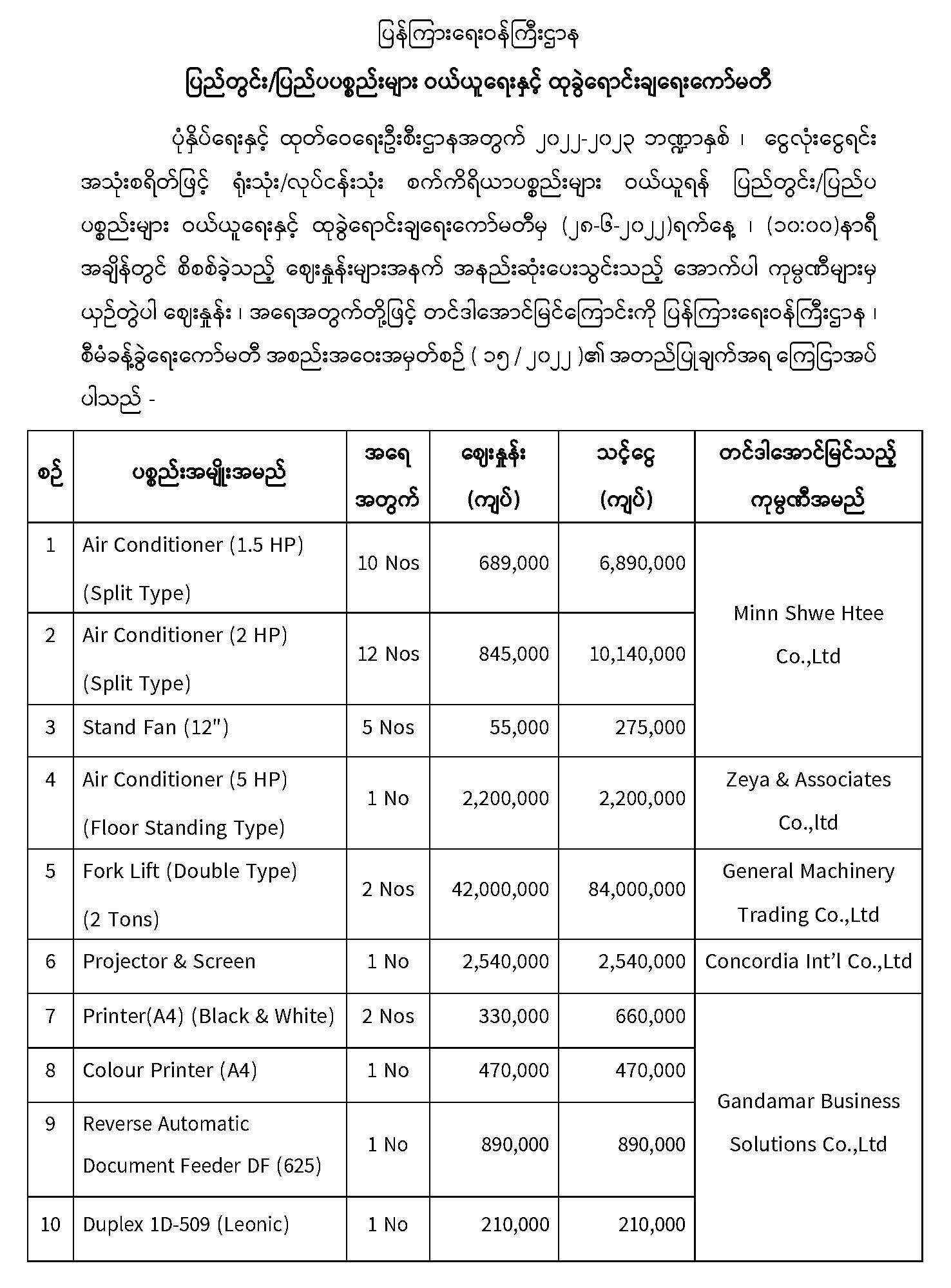 ပြည်တွင်း/ပြည်ပပစ္စည်းများ ဝယ်ယူရေးနှင့် ထုခွဲရောင်းချရေးကော်မတီ 07/04/2022 ပြည်တွင်း/ပြည်ပပစ္စည်းများ ဝယ်ယူရေးနှင့် ထုခွဲရောင်းချရေးကော်မတီ