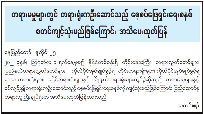 တရားမမှုများတွင် တရားရုံးက ဦးဆောင်သည့် စေ့စပ်ဖြေရှင်းရေးစနစ် စတင်ကျင့်သုံးမည်ဖြစ်ကြောင်း အသိပေးထုတ်ပြန် 07/26/2022
