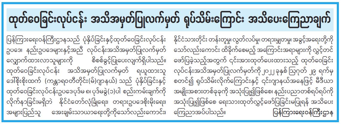 ထုတ်ဝေခြင်းလုပ်ငန်း အသိအမှတ်ပြုလက်မှတ် ရုပ်သိမ်းကြောင်း အသိပေးကြေညာချက် 09/03/2022 ထုတ်ဝေခြင်းလုပ်ငန်း အသိအမှတ်ပြုလက်မှတ် ရုပ်သိမ်းကြောင်း အသိပေးကြေညာချက်