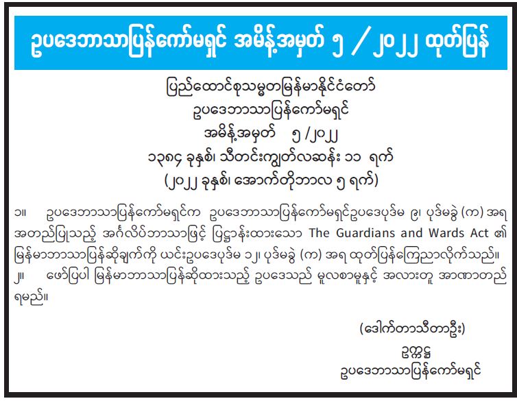 ဥပဒေဘာသာပြန်ကော်မရှင် အမိန့်အမှတ် ၅ /၂၀၂၂ ထုတ်ပြန်