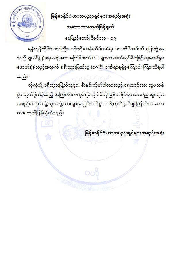 မြန်မာနိုင်ငံဟာသပညာရှင်များ အစည်းအရုံးသဘောထားထုတ်ပြန်ချက်