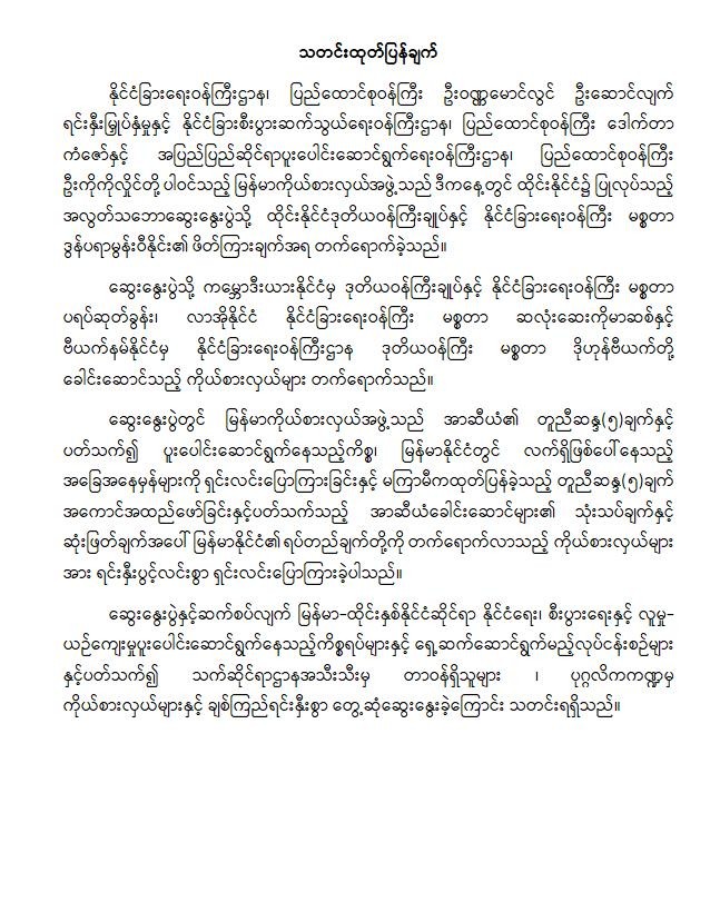 ဆွေးနွေးပွဲတွင် မြန်မာကိုယ်စားလှယ်အဖွဲ့သည် .. အာဆီယံ၏ တူညီဆန္ဒ(၅)ချက်နှင့် ပတ်သက်၍ ပူးပေါင်းဆောင်ရွက်နေသည့်ကိစ္စ၊ မြန်မာနိုင်ငံတွင် လက်ရှိဖြစ်ပေါ်နေသည့် အခြေအနေမှန်များကို ရှင်းလင်းပြောကြားခြင်းနှင့် မကြာမီကထုတ်ပြန်ခဲ့သည့် တူညီဆန္ဒ(၅)ချက် အကောင်အထည်ဖော်ခြင်းနှင့် ပတ်သက်သည့် အာဆီယံခေါင်းဆောင်များ၏ သုံးသပ်ချက်နှင့် ဆုံးဖြတ်ချက်အပေါ် မြန်မာနိုင်ငံ၏ ရပ်တည်ချက်တို့ကို တက်ရောက်လာသည့် ကိုယ်စားလှယ်များအား ရင်းနှီးပွင့်လင်းစွာ ရှင်းလင်းပြောကြားခဲ့ပါသည်။