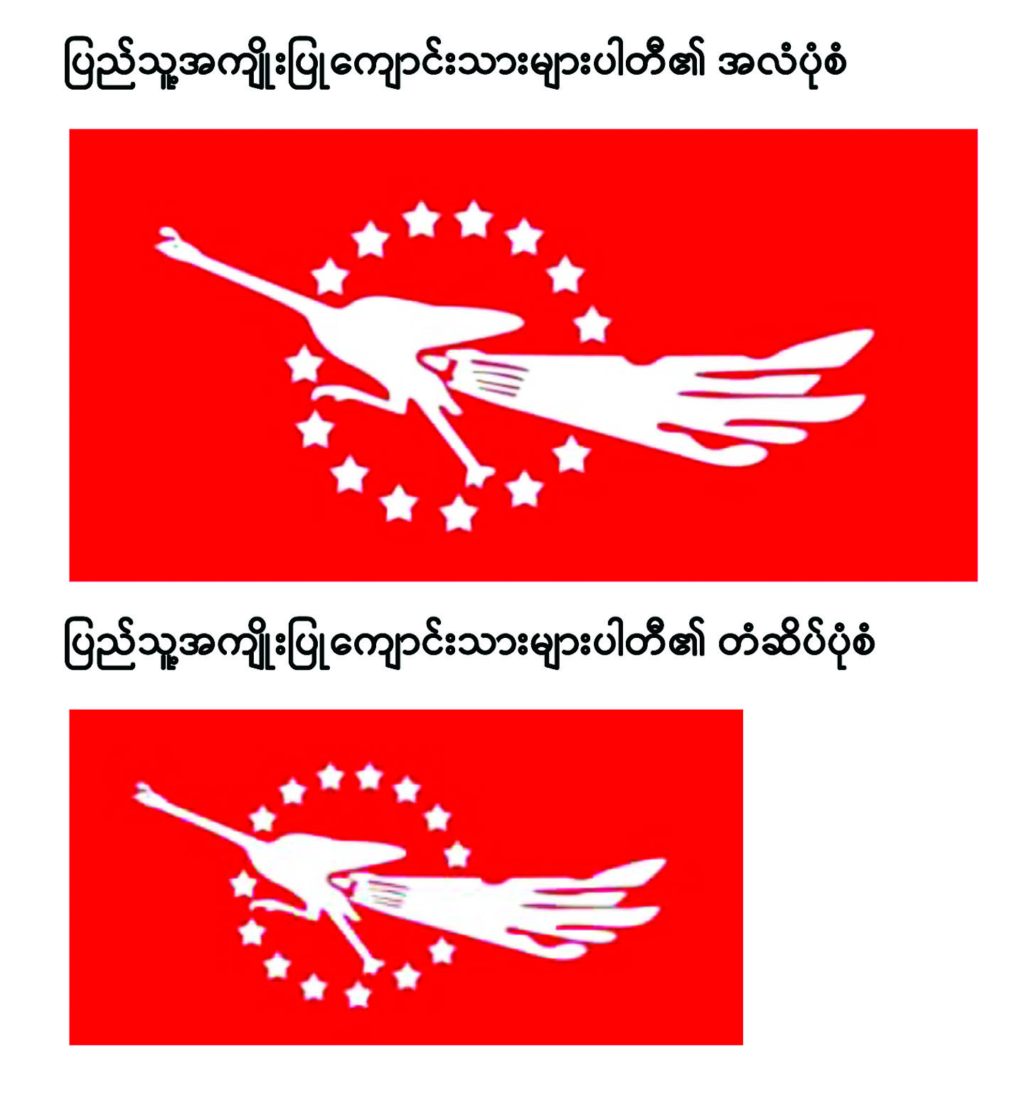၂။ ယင်းအဖွဲ့အစည်းက အသုံးပြုမည့်ပါတီအမည်၊ အလံနှင့် တံဆိပ်တို့ကိုကန့်ကွက်လိုက ယခုကြေညာသည့်နေ့မှစ၍ (၇)ရက်အတွင်း ခိုင်လုံသောအထောက်အထားများဖြင့် ပြည်ထောင်စုရွေးကောက်ပွဲကော်မရှင်သို့ ကန့်ကွက်နိုင်ပါကြောင်း၊ နိုင်ငံရေးပါတီများမှတ်ပုံတင်ခြင်း နည်းဥပဒေ ၁၄ (ဃ) အရ အများသိစေရန် ကြေညာအပ်ပါသည်။
