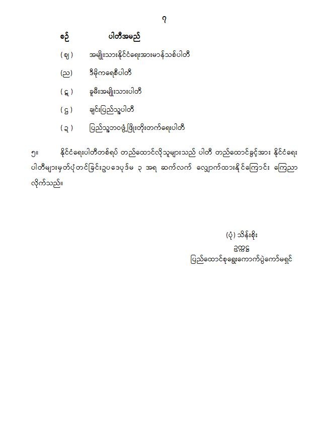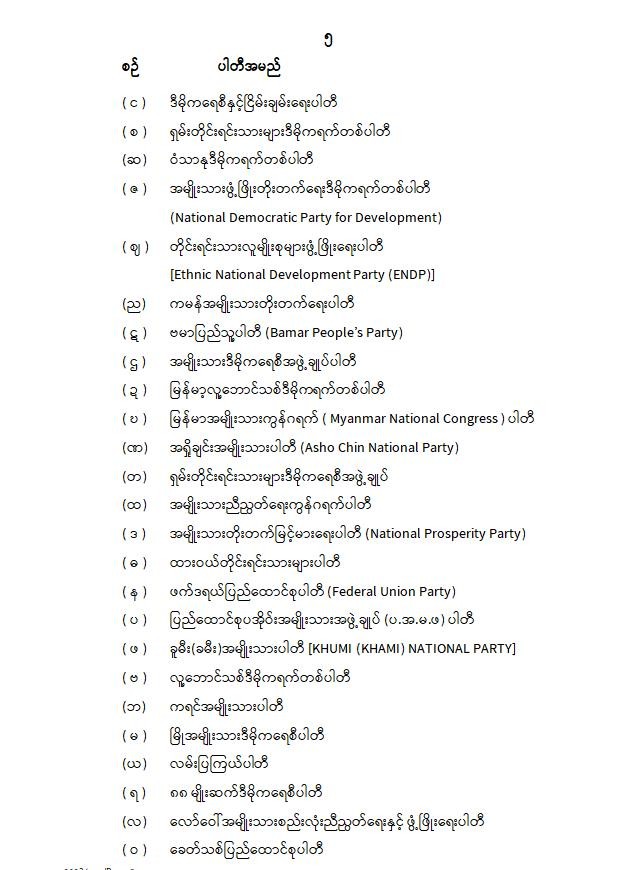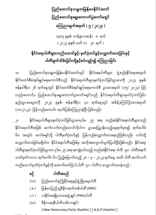 နိုင်ငံရေးပါတီများတည်ထောင်ခွင့်၊ မှတ်ပုံတင်ခွင့်လျှောက်ထားခြင်းနှင့် ပါတီဖျက်သိမ်းခြင်းတို့နှင့်စပ်လျဉ်း၍ ကြေညာခြင်း
