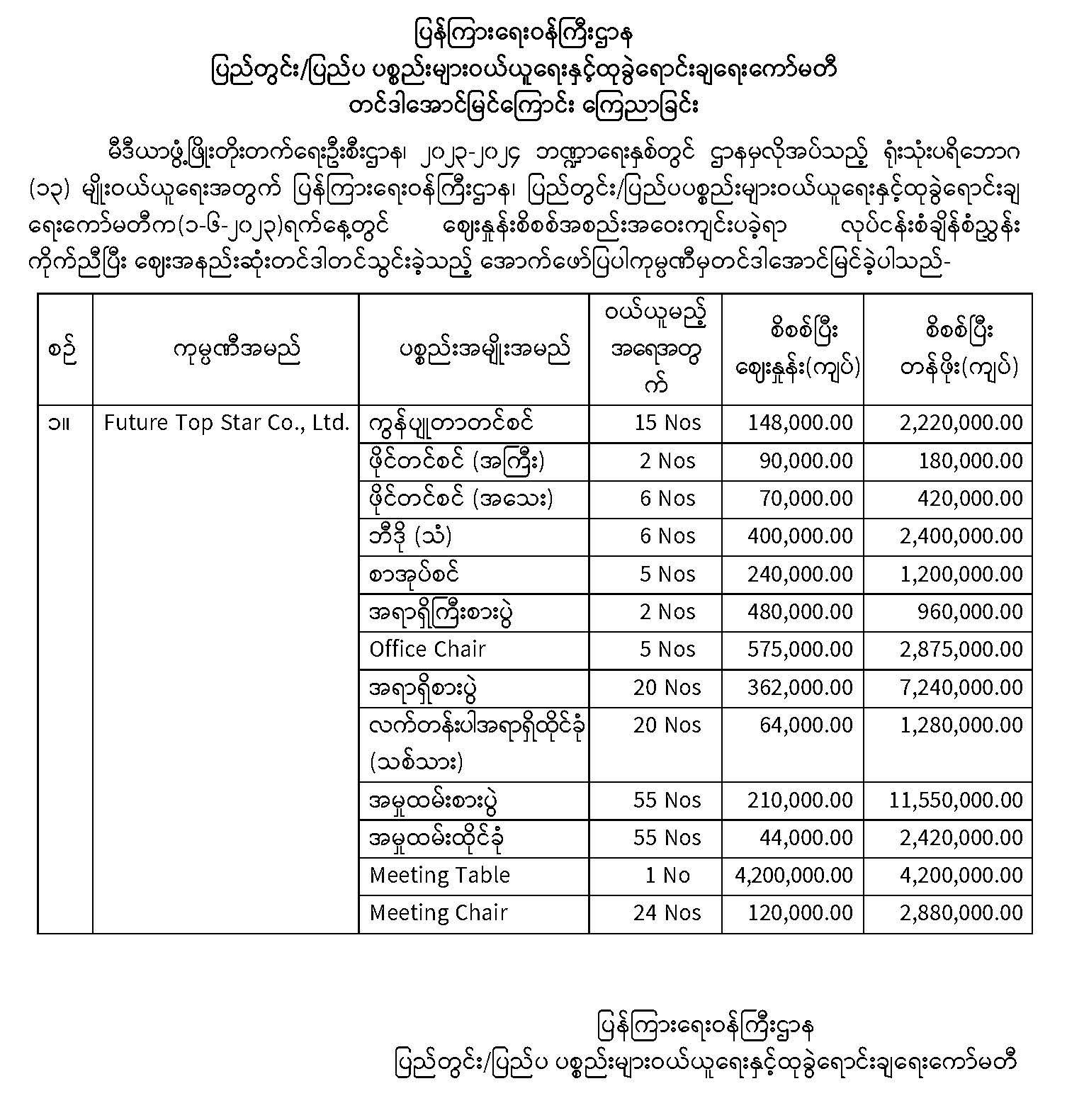 ပြန်ကြားရေးဝန်ကြီးဌာန ပြည်တွင်း/ပြည်ပ ပစ္စည်းများဝယ်ယူရေးနှင့် ထုခွဲရောင်းချရေးကော်မတီ တင်ဒါအောင်မြင်ကြောင်း ကြေညာခြင်း
