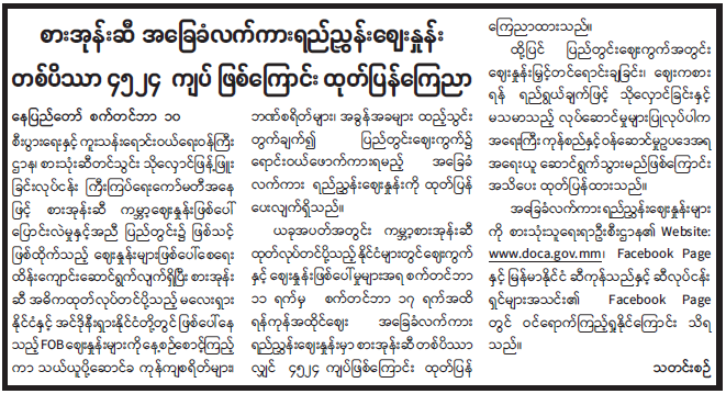 ထို့ပြင်     ပြည်တွင်းဈေးကွက်အတွင်း ဈေးနှုန်းမြှင့်တင်ရောင်းချခြင်း၊   ဈေးကစားရန်    ရည်ရွယ်ချက်ဖြင့်   သိုလှောင်ခြင်းနှင့် မသမာသည့် လုပ်ဆောင်မှုများပြုလုပ်ပါက အရေးကြီး ကုန်စည်နှင့် ဝန်ဆောင်မှုဥပဒေအရ အရေးယူဆောင်ရွက်သွားမည်ဖြစ်ကြောင်း အသိပေး ထုတ်ပြန်ထားသည်။