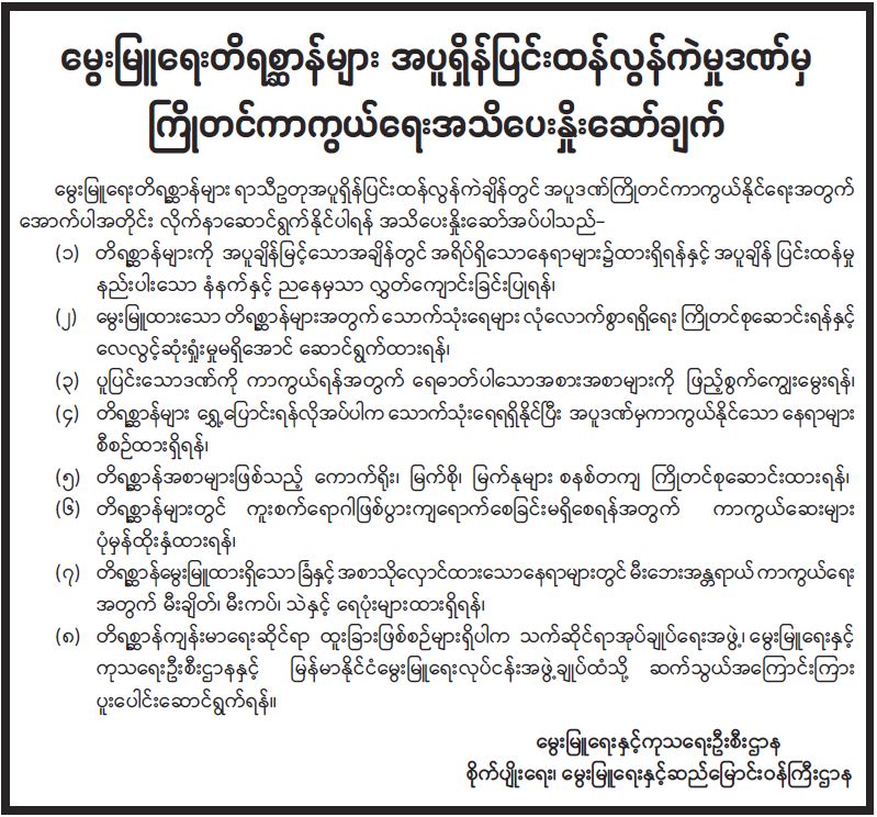 (၂) မွေးမြူထားသော တိရစ္ဆာန်များအတွက် သောက်သုံးရေများ လုံလောက်စွာရရှိရေး ကြိုတင်စုဆောင်းရန်နှင့် လေလွင့်ဆုံးရှုံးမှုမရှိအောင် ဆောင်ရွက်ထားရန်၊