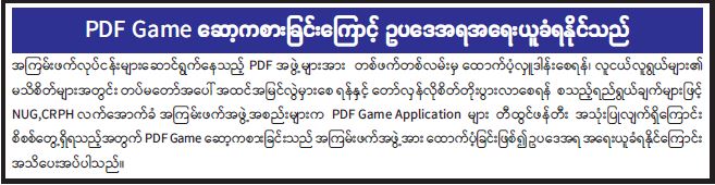 အကြမ်းဖက်လုပ်ငန်းများဆောင်ရွက်နေသည့် PDF အဖွဲ့များအား တစ်ဖက်တစ်လမ်းမှ ထောက်ပံ့လှူဒါန်းစေရန်၊ လူငယ်လူရွယ်များ၏ မသိစိတ်များအတွင်း တပ်မတော်အပေါ် အထင်အမြင်လွဲမှားစေရန်နှင့် တော်လှန်လိုစိတ်တိုးပွားလာစေရန် စသည့်ရည်ရွယ်ချက်များဖြင့် NUG,CRPH လက်အောက်ခံအကြမ်းဖက်အဖွဲ့အစည်းများက PDF Game Application များ တီထွင်ဖန်တီး အသုံးပြုလျက်ရှိကြောင်း စိစစ်တွေ့ရှိရသည့်အတွက် PDF Game ဆော့ကစားခြင်းသည် အကြမ်းဖက်အဖွဲ့အား ထောက်ပံ့ခြင်းဖြစ်၍ ဥပဒေအရ အရေးယူခံရနိုင်ကြောင်း အသိပေးအပ်ပါသည်။
