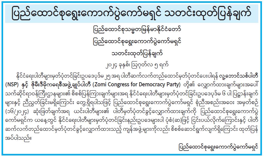 နိုင်ငံရေးပါတီများမှတ်ပုံတင်ခြင်းဥပဒေပုဒ်မ ၂၅ အရ ပါတီဆက်လက်တည်ထောင်မှတ်ပုံတင်ပေးပါရန် လူ့ဘောင်သစ်ပါတီ (NSP) နှင့် ဇိုမီးဒီမိုကရေစီအဖွဲ့ချုပ်ပါတီ (Zomi Congress for Democracy Party) တို့၏ လျှောက်ထားချက်များအပေါ် သက်ဆိုင်ရာဝန်ကြီးဌာနများ၏ စိစစ်ပြန်ကြားချက်များအရ နိုင်ငံရေးပါတီများမှတ်ပုံတင်ခြင်းဥပဒေပုဒ်မ ၆ ပါ ပြဋ္ဌာန်းချက်များနှင့် ညီညွတ်ခြင်းမရှိကြောင်း တွေ့ရှိရပါသဖြင့် ပြည်ထောင်စုရွေးကောက်ပွဲကော်မရှင် စုံညီအစည်းအဝေးအမှတ်စဉ် (၁၆/၂၀၂၄) ဆုံးဖြတ်ချက်အရ ယင်းပါတီများ၏ ပါတီမှတ်ပုံတင်ခွင့်လျှောက်ထားချက်ကို ပြည်ထောင်စုရွေးကောက်ပွဲကော်မရှင်က ယနေ့တွင် နိုင်ငံရေးပါတီများမှတ်ပုံတင်ခြင်းနည်းဥပဒေများပါ ပုံစံ(ဆ)ဖြင့် ငြင်းပယ်လိုက်ကြောင်းနှင့် ပါတီဆက်လက်တည်ထောင်မှတ်ပုံတင်ခွင့်လျှောက်ထားသည့် ကျန်အဖွဲ့များကိုလည်း စိစစ်ဆောင်ရွက်လျက်ရှိကြောင်း ထုတ်ပြန် အပ်ပါသည်။