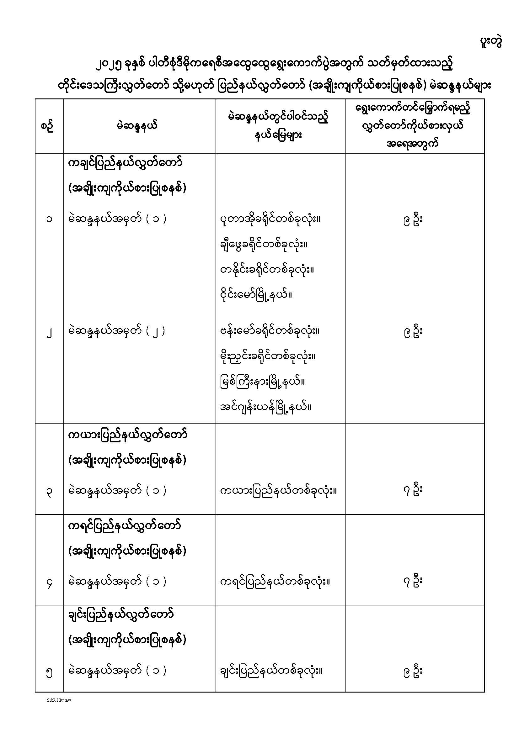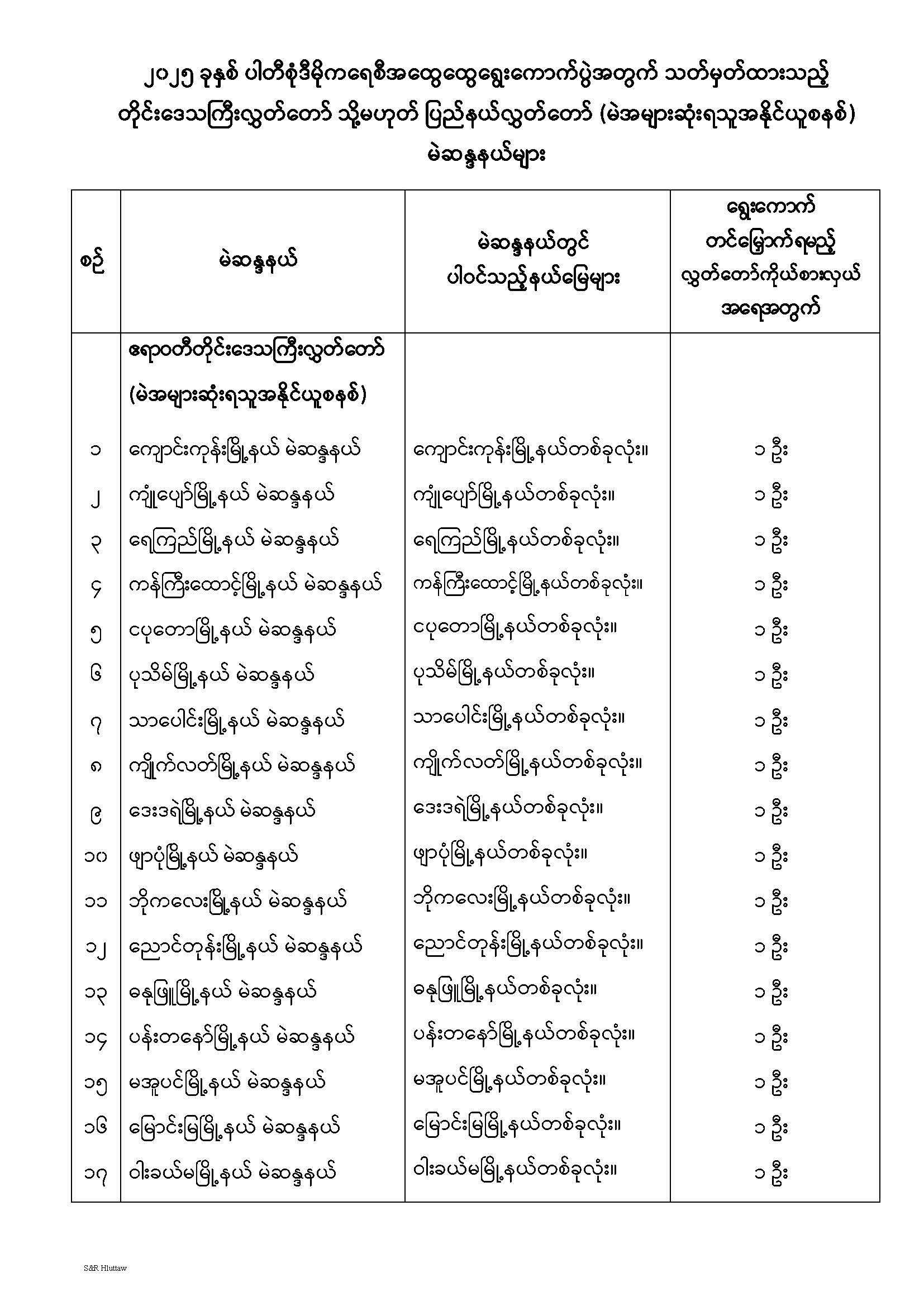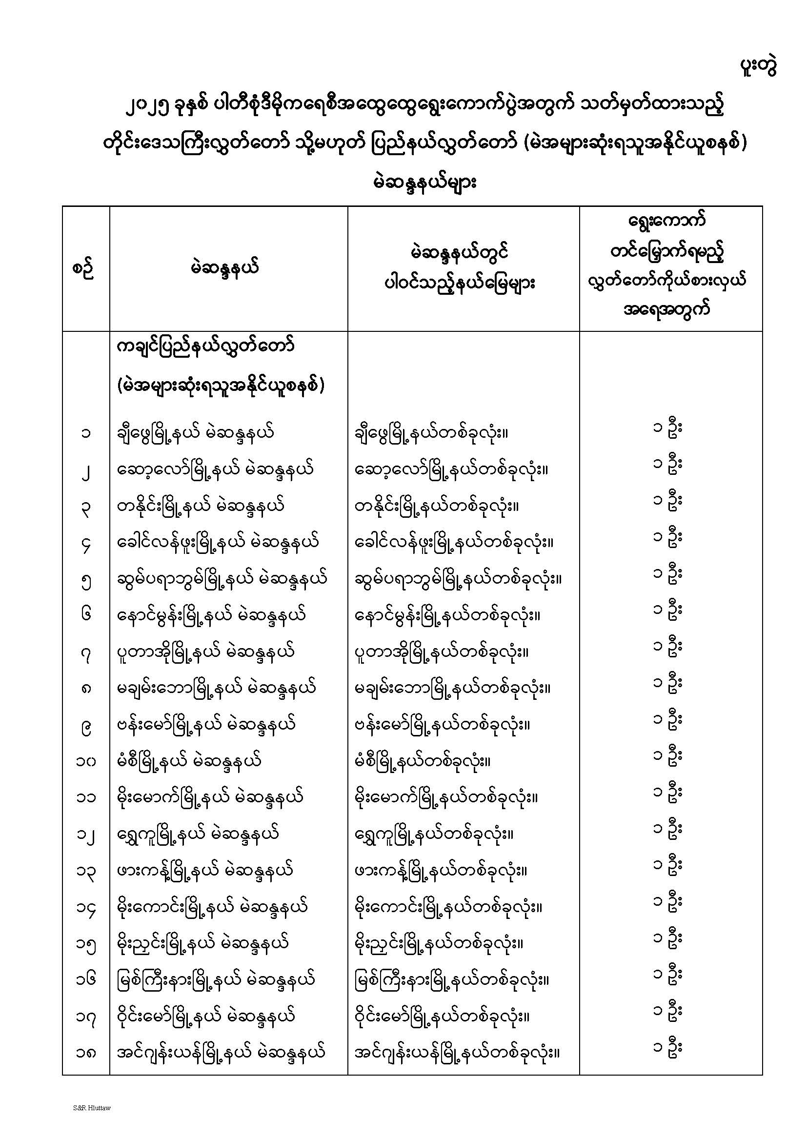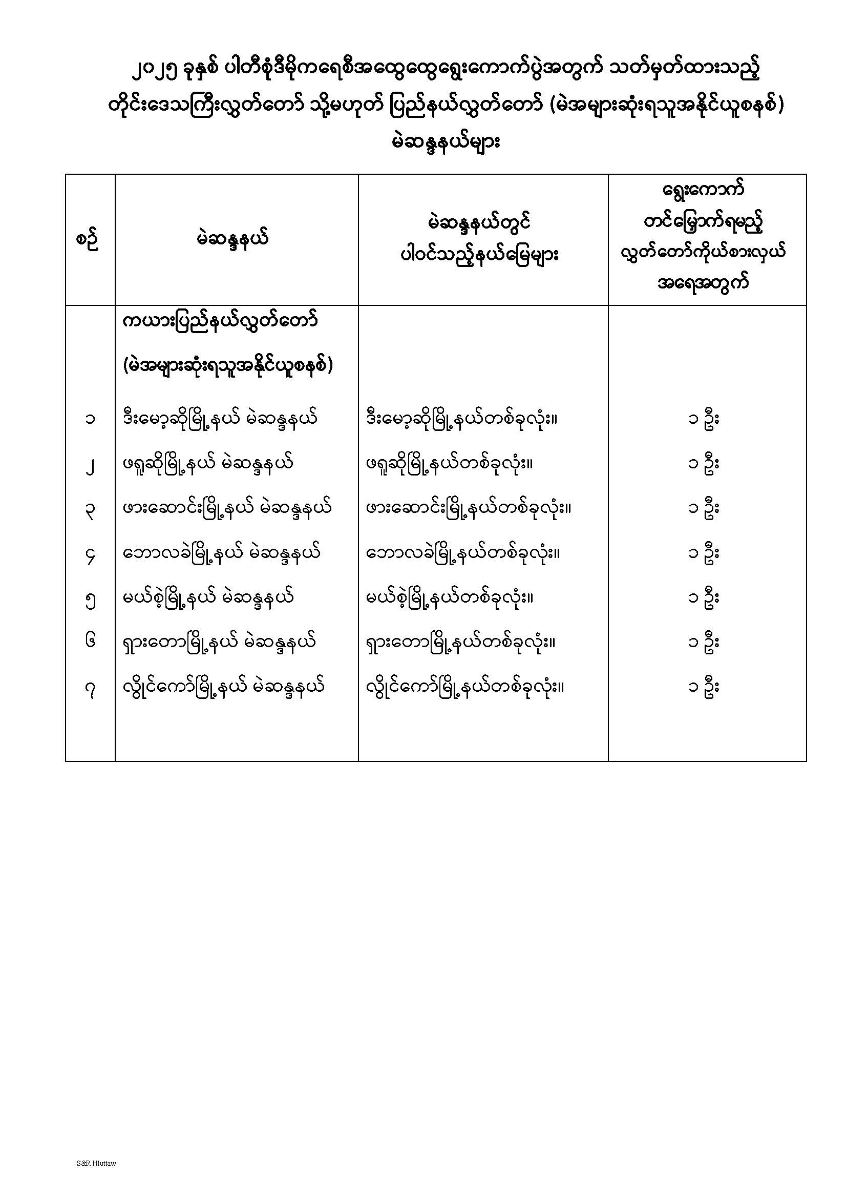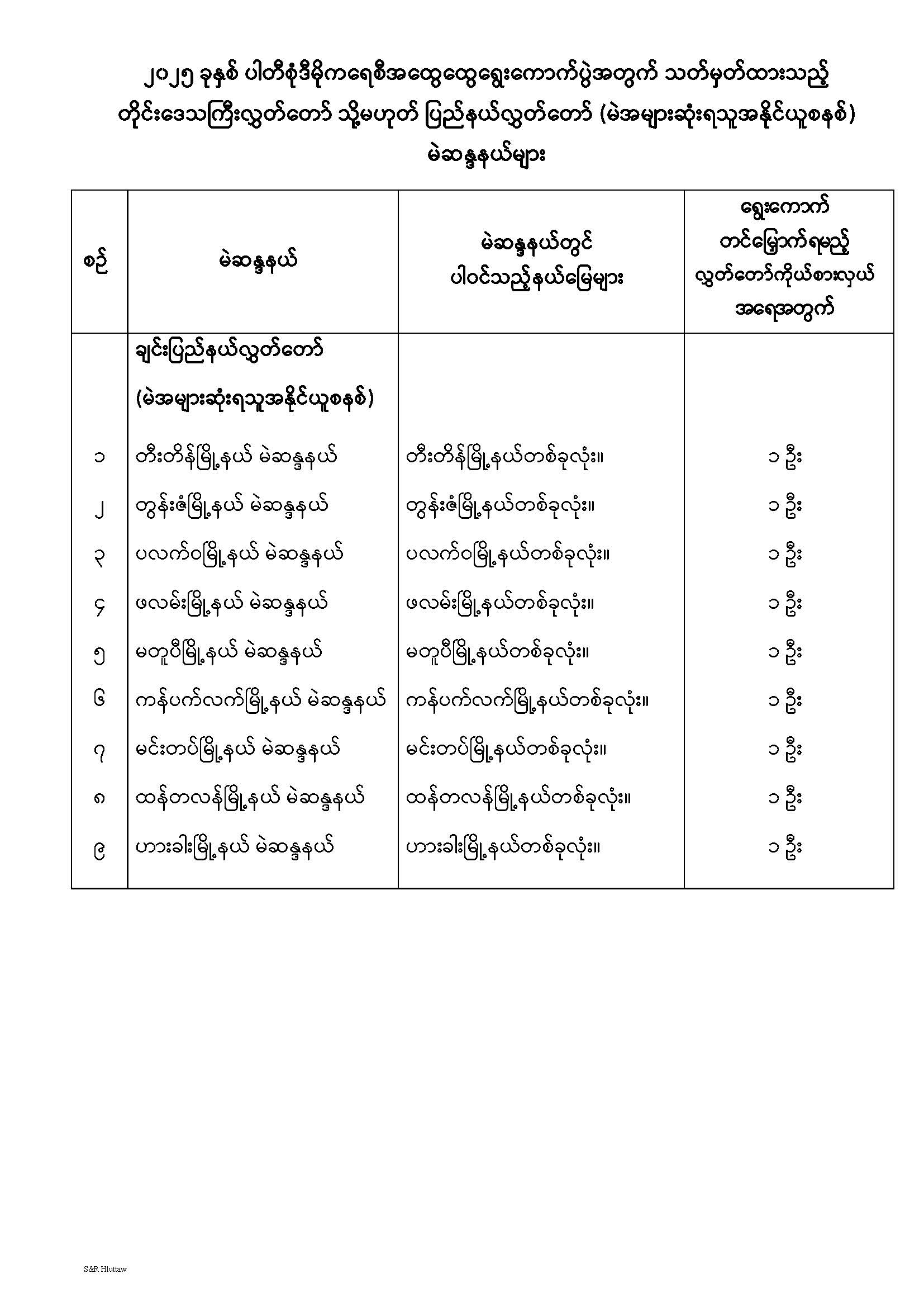 တိုင်းဒေသကြီးလွှတ်တော် သို့မဟုတ် ပြည်နယ်လွှတ်တော် မဲဆန္ဒနယ်များ သတ်မှတ်ကြေညာခြင်း