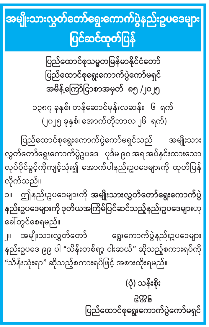 အမျိုးသားလွှတ်တော်ရွေးကောက်ပွဲနည်းဥပဒေများ ပြင်ဆင်ထုတ်ပြန်