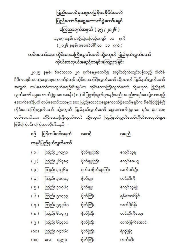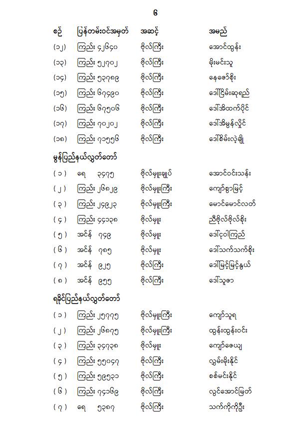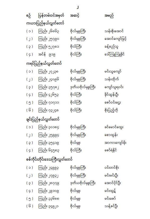 တပ်မတော်သား တိုင်းဒေသကြီးလွှတ်တော် သို့မဟုတ် ပြည်နယ်လွှတ်တော် ကိုယ်စားလှယ်အမည်စာရင်းကြေညာခြင်း 03/08/2026