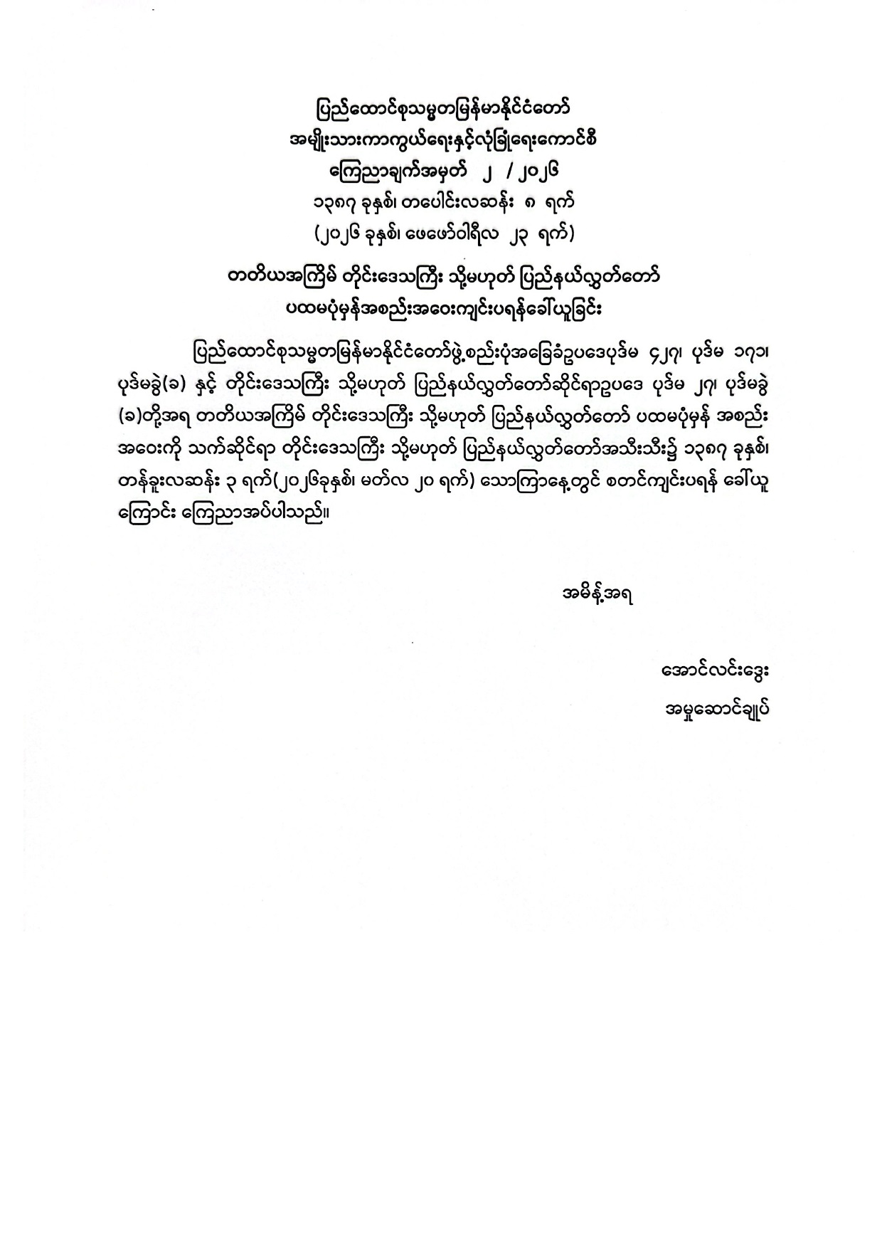 တတိယအကြိမ် တိုင်းဒေသကြီး သို့မဟုတ် ပြည်နယ်လွှတ်တော် ပထမပုံမှန်အစည်းအဝေးကျင်းပရန်ခေါ်ယူခြင်း 02/23/2026
