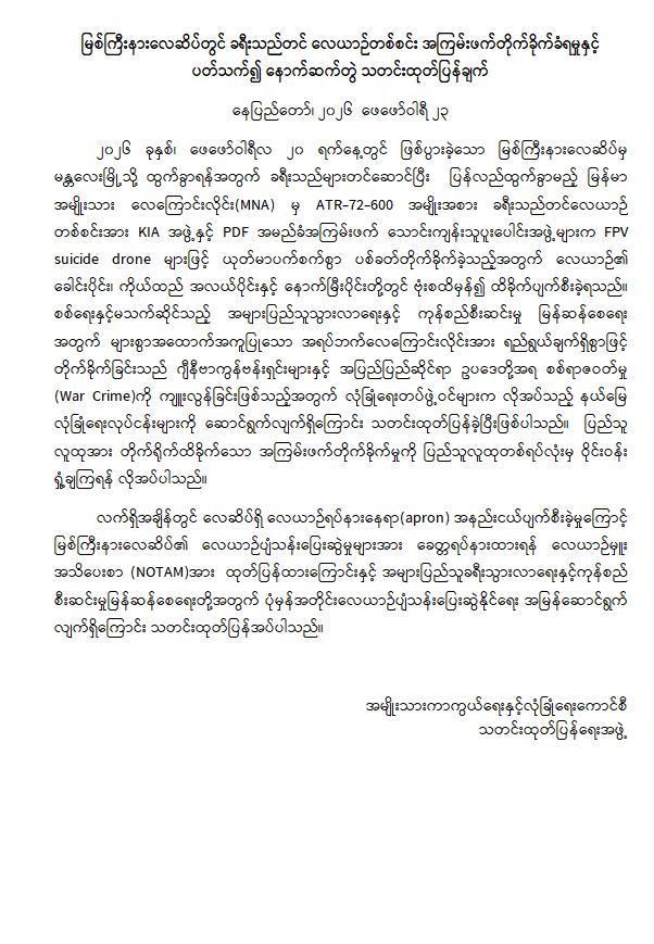 မြစ်ကြီးနားလေဆိပ်တွင် ခရီးသည်တင် လေယာဉ်တစ်စင်း အကြမ်းဖက်တိုက်ခိုက်ခံရမှုနှင့် ပတ်သက်၍ နောက်ဆက်တွဲ သတင်းထုတ်ပြန်ချက် 02/23/2026