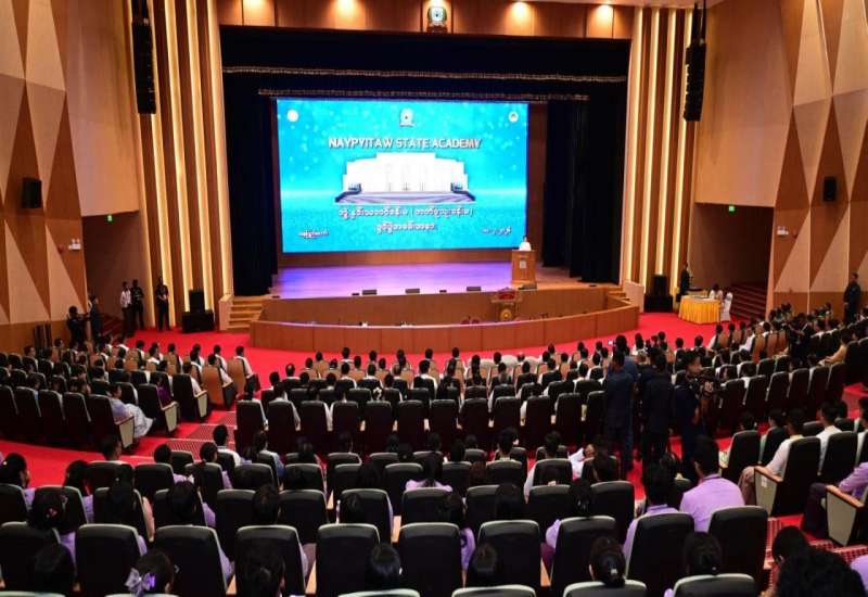 နေပြည်တော်ကောင်စီနယ်မြေ၊ ဇမ္ဗူသီရိမြို့နယ်ရှိ Naypyitaw State Academy (ဘွဲ့နှင်းသဘင်ခန်းမ) ဘက်စုံသုံးခန်းမဖွင့်ပွဲအခမ်းအနားကို ယနေ့နံနက်ပိုင်းတွင် ကျင်းပပြုလုပ်ရာ ပြည်ထောင်စုသမ္မတမြန်မာနိုင်ငံတော်ယာယီသမ္မတ နိုင်ငံတော်လုံခြုံရေးနှင့်အေးချမ်းသာယာရေးကော်မရှင်ဥက္ကဋ္ဌ ဗိုလ်ချုပ်မှူးကြီး မင်းအောင်လှိုင် တက်ရောက်ဖွင့်လှစ်ပေးပြီး အမှာစကားပြောကြားသည်။