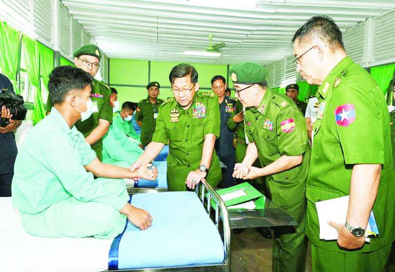 နိုင်ငံတော်စီမံအုပ်ချုပ်ရေးကောင်စီဥက္ကဋ္ဌ တပ်မတော်ကာကွယ်ရေးဦးစီးချုပ် ဗိုလ်ချုပ်မှူးကြီး မင်းအောင်လှိုင်သည် ယနေ့ညနေပိုင်းတွင် မိတ္ထီလာမြို့ရှိ တပ်မတော်ဆေးရုံ၌ တက်ရောက်ကုသမှုခံယူလျက်ရှိသည့် နိုင်ငံတော်ကာကွယ်ရေးနှင့် လုံခြုံရေးတာဝန်များထမ်းဆောင်စဉ် ထိခိုက်ဒဏ်ရာရရှိခဲ့သော အရာရှိ၊ စစ်သည်များအား သွားရောက်ကြည့်ရှုအားပေးစကားပြောကြားသည်။