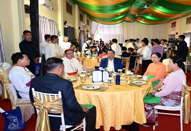 မြန်မာနိုင်ငံခရစ်ယာန်အသင်းတော်ပေါင်းစုံအဖွဲ့ချုပ်ကြီးများက ကြီးမှူးကျင်းပသည့် ခရစ်တော်မွေးနေ့ (ခရစ္စမတ်) ကျေးဇူးတော် ချီးမွမ်းခြင်းနှင့် မိတ်သဟာယမိတ်ဆုံစားပွဲအခမ်းအနားကို ယနေ့နံနက်ပိုင်းတွင် ရန်ကုန်တိုင်းဒေသကြီး၊ ဗိုလ်တထောင်မြို့နယ်ရှိ စိန့်မေရီကာသီဒြယ်ကက်သလစ်ဘုရားကျောင်းတော်ကြီး၌ ကျင်းပပြုလုပ်ရာ ပြည်ထောင်စုသမ္မတမြန်မာနိုင်ငံတော်ယာယီသမ္မတ နိုင်ငံတော်လုံခြုံရေးနှင့်အေးချမ်းသာယာရေးကော်မရှင်ဥက္ကဋ္ဌ ဗိုလ်ချုပ်မှူးကြီး မင်းအောင်လှိုင် တက်ရောက်ချီးမြှင့်သည်။