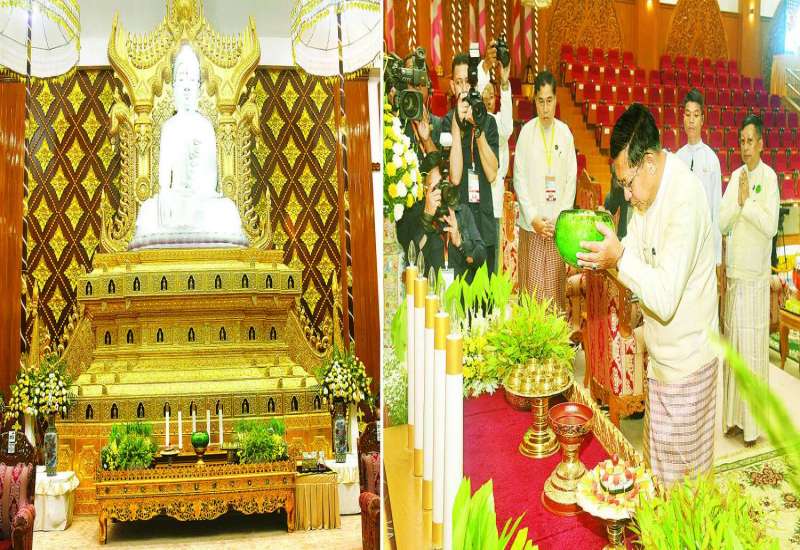 မာရဝိဇယဗုဒ္ဓရုပ်ပွားတော်မြတ်ကြီးအား ၂၀၂၅ ခုနှစ် တန်ဆောင်တိုင်ပွဲတော် မသိုးရွှေကြာသင်္ကန်းဆက်ကပ်လှူဒါန်းခြင်းမဟာမင်္ဂလာအခမ်းအနားကို ယနေ့နံနက် မင်္ဂလာအချိန်တွင် ကျင်းပပြုလုပ်ရာ ပြည်ထောင်စုသမ္မတမြန်မာနိုင်ငံတော်ယာယီသမ္မတ နိုင်ငံတော်လုံခြုံရေးနှင့်အေးချမ်းသာယာရေးကော်မရှင်ဥက္ကဋ္ဌ ဗိုလ်ချုပ်မှူးကြီး မင်းအောင်လှိုင် တက်ရောက်၍ မသိုးရွှေကြာသင်္ကန်း ဆက်ကပ်လှူဒါန်းသည်။