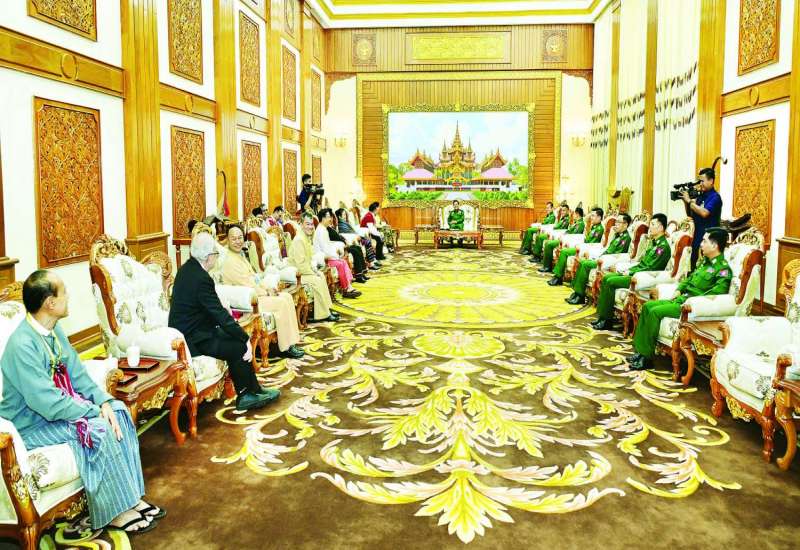နိုင်ငံတော်လုံခြုံရေးနှင့် အေးချမ်းသာယာရေးကော်မရှင်ဥက္ကဋ္ဌ တပ်မတော်ကာကွယ်ရေးဦးစီးချုပ် ဗိုလ်ချုပ်မှူးကြီး မင်းအောင်လှိုင်ထံသို့ ငြိမ်းချမ်းရေးဆွေးနွေးပွဲသို့ တက်ရောက်ခဲ့သည့် တိုင်းရင်းသားလက်နက်ကိုင်ကိုယ်စားလှယ်အဖွဲ့များက ယနေ့နံနက်ပိုင်းတွင် နေပြည်တော်ရှိ ဘုရင့်နောင်ရိပ်သာဧည့်ခန်းမ၌ လာရောက်ဂါရဝပြုတွေ့ဆုံသည်။