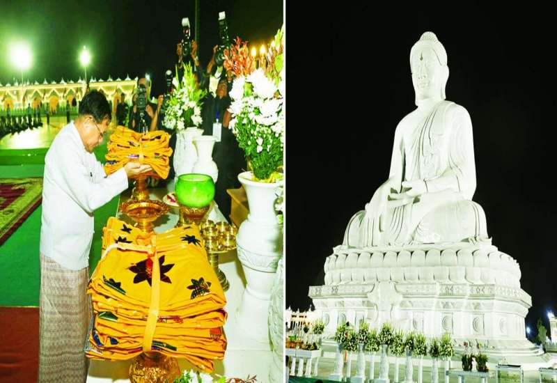 ပြည်ထောင်စုနယ်မြေ နေပြည်တော် ဒက္ခိဏသီရိမြို့နယ်ရှိ မာရဝိဇယဗုဒ္ဓရုပ်ပွားတော်မြတ်ကြီး ၂၀၂၅ ခုနှစ်၊ တန်ဆောင်တိုင်မီးထွန်းပွဲတော် မီးပုံးပျံလွှတ်တင်ပူဇော်ပြိုင်ပွဲနှင့် မသိုးရွှေကြာသင်္ကန်း ရက်လုပ်ပူဇော်ပြိုင်ပွဲ ဆုချီးမြှင့်ပွဲအခမ်းအနားကို ယနေ့ညပိုင်းတွင် မာရဝိဇယဗုဒ္ဓဥယျာဉ်တော် အတွင်းရှိ ရေပန်းရင်ပြင်တော်၌ စည်ကားသိုက်မြိုက်စွာဖြင့် ကျင်းပပြုလုပ်ရာ ပြည်ထောင်စုသမ္မတမြန်မာနိုင်ငံတော်ယာယီသမ္မတ နိုင်ငံတော်လုံခြုံရေးနှင့်အေးချမ်းသာယာရေးကော်မရှင်ဥက္ကဋ္ဌ ဗိုလ်ချုပ်မှူးကြီး မင်းအောင်လှိုင် တက်ရောက်ချီးမြှင့်သည်။