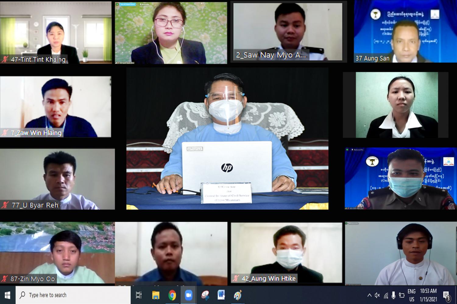 သင်တန်းဆင်းပွဲအခမ်းအနားသို့ ဝန်ကြီးဌာနနှင့်အဖွဲ့အစည်း(၃၃)ခုမှ ဒုတိယဦးစီးမှူးအဆင့်ရှိ အရာထမ်းငယ် သင်တန်းသား(၄၉)ဦး၊သင်တန်းသူ(၆၃)ဦး၊စုစုပေါင်း(၁၁၂)ဦးတို့က Online ဖြင့် တက် ရောက်ခဲ့ကြပြီး သင်တန်းကာလ ရက်သတ္တ(၄) ပတ်ကြာ Zoom Cloud Meetings နှင့် Google Classroom တို့ကို အသုံးပြု၍ Online Learning System ဖြင့် သင်ကြားပို့ချခဲ့ကြောင်း သိရသည်။
