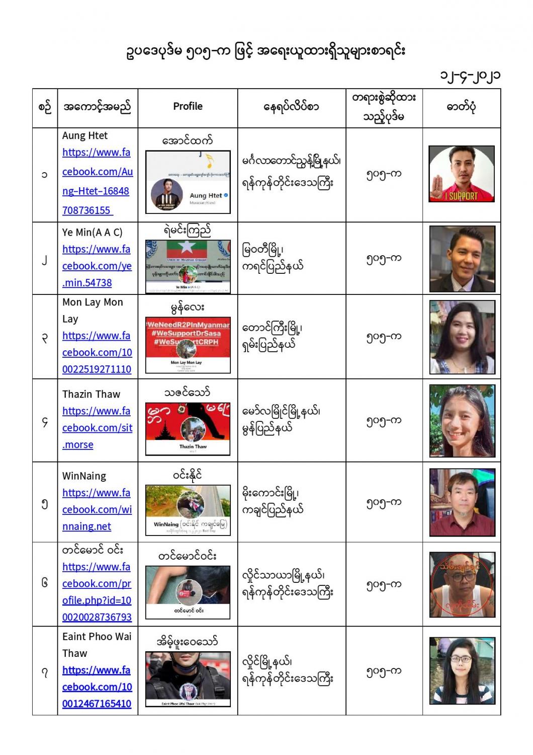 နိုင်ငံတော်၏ အုပ်ချုပ်မှုယန္တရားပျက်ပြားစေရန်ရည်ရွက်ချက်ဖြင့် နိုင်ငံ့ဝန်ထမ်းများအား CDM လှုပ်ရှားမှုတွင် ပါဝင်စေရန်လှုံ့ဆော်ခြင်း၊ CRPH မတရားအသင်းအား ထောက်ခံသည့် အကြောင်းအရာများ၊ မမှန်သတင်းများအားဖြန့်ဝေခြင်း၊ နိုင်ငံတော်တည်ငြိမ်အေးချမ်းမှုကို ပျက်ပြားစေပြီး ဆူပူအုံကြွမှုဖြစ်ပေါ်စေရန်နှင့် အများပြည်သူအထိတ်တလန့်ဖြစ်စေရန် အတွက် သွေးထိုးလှုံ့ဆော်မှုများပြုလုပ်ခြင်း၊ Social Pumishment ပြုလုပ်ခြင်းများကို လူမှုကွန်ရက် စာမျက်နှာများတွင် ရည်ရွယ်ချက်ရှိရှိ ဖြင့်ဖော်ပြခြင်းနှင့် ဖြန့်ဝေခြင်းများ ဆောင်ရွက် လျက်ရှိသည့် အောက်ဖော်ပြပါ အနုပညာရှင်အချို့နှင့် အခြားပါဝင်ပတ်သက်သူများအား ရာဇသတ်ကြီးပုဒ်မ ၅၀၅-က ဖြင့် အမှုဖွင့်အရေးယူ ဆောင်ရွက်လျက်ရှိပါသည်။