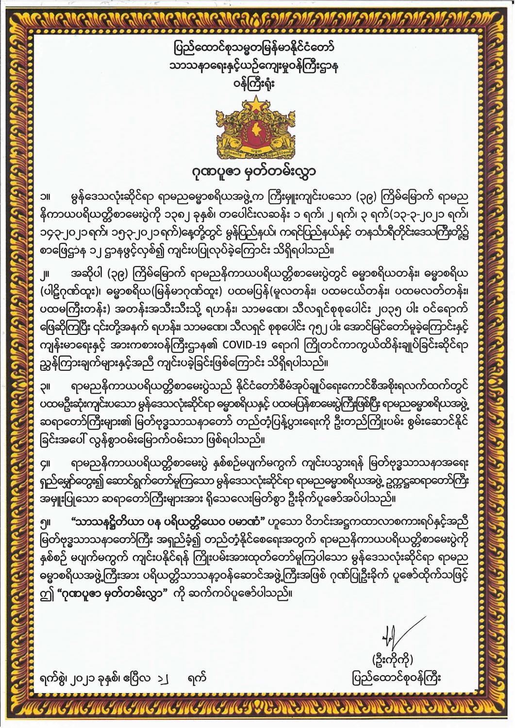 မွန်ဒေသလုံးဆိုင်ရာ ရာမညဓမ္မာစရိယအဖွဲ့က ကြီးမှူးကျင်းပသော (၃၉)ကြိမ်မြောက် ရာမည နိကာယပရိယတ္တိစာမေးပွဲကြီးကို မတ် ၁၃ ရက်မှ ၁၅ ရက်အထိ မွန်ပြည်နယ်၊ ကရင်ပြည်နယ် နှင့်တနင်္သာရီတိုင်းဒေသကြီးတို့ရှိ စာဖြေဌာန ၁၂ ဌာနတို့တွင် ကျန်းမာရေးနှင့်အားကစားဝန်ကြီး ဌာနက ထုတ်ပြန်ထားသော COVID-19 ရောဂါ ကာကွယ်တားဆီးရေးဆိုင်ရာ ညွှန်ကြားချက် များနှင့်အညီ အောင်မြင်စွာ ကျင်းပနိုင်ခဲ့သည်။