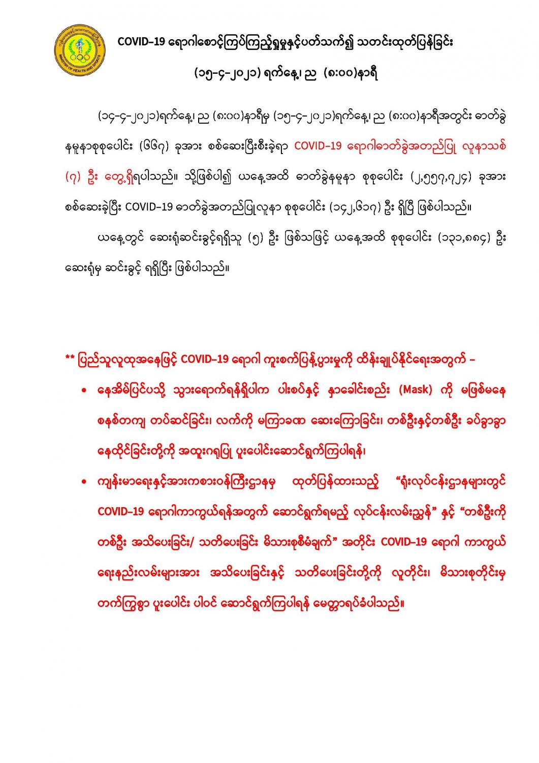 COVID-19 ရောဂါစောင့်ကြပ်ကြည့်ရှုမှုနှင့်ပတ်သက်၍ သတင်းထုတ်ပြန်ခြင်း (၁၅-၄-၂၀၂၁) ရက်နေ့၊ ည (၈:၀၀)နာရီ 04/15/2021 နေပြည်တော်