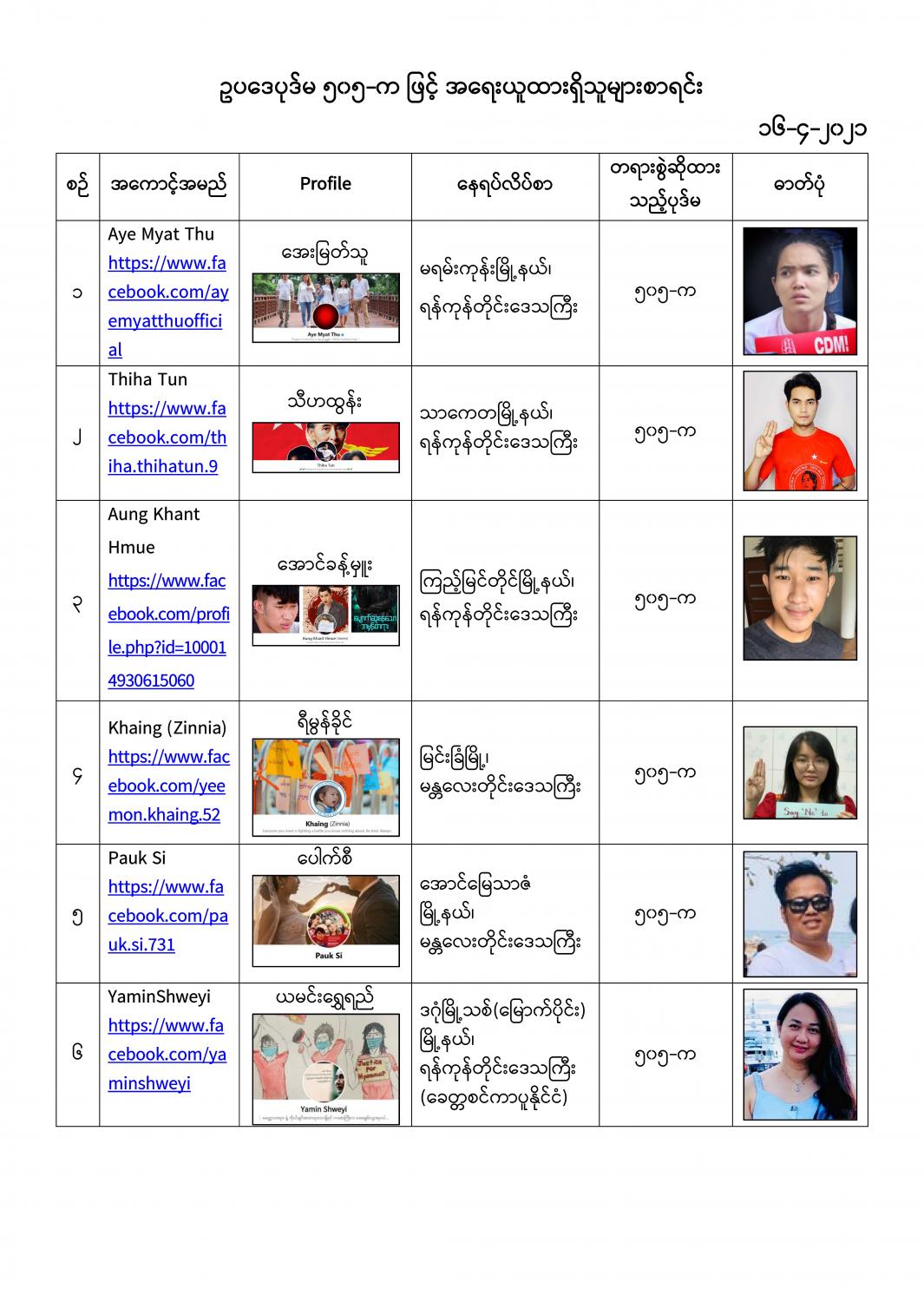 နိုင်ငံတော်၏ အုပ်ချုပ်မှုယန္တရားပျက်ပြားစေရန်ရည်ရွက်ချက်ဖြင့် နိုင်ငံ့ဝန်ထမ်းများအား CDM လှုပ်ရှားမှုတွင် ပါဝင်စေရန်လှုံ့ဆော်ခြင်း၊ CRPH မတရားအသင်းအား ထောက်ခံသည့် အကြောင်းအရာများ၊ မမှန်သတင်းများအားဖြန့်ဝေခြင်း၊ နိုင်ငံတော်တည်ငြိမ်အေးချမ်းမှုကို ပျက်ပြားစေပြီး ဆူပူအုံကြွမှုဖြစ်ပေါ်စေရန်နှင့် အများပြည်သူအထိတ်တလန့်ဖြစ်စေရန် အတွက် သွေးထိုးလှုံ့ဆော်မှုများပြုလုပ်ခြင်း၊ Social Pumishment ပြုလုပ်ခြင်းများကို လူမှုကွန်ရက် စာမျက်နှာများတွင် ရည်ရွယ်ချက်ရှိရှိ ဖြင့်ဖော်ပြခြင်းနှင့် ဖြန့်ဝေခြင်းများ ဆောင်ရွက် လျက်ရှိသည့် အောက်ဖော်ပြပါ အနုပညာရှင်အချို့နှင့် အခြားပါဝင်ပတ်သက်သူများအား ရာဇသတ်ကြီးပုဒ်မ ၅၀၅-က ဖြင့် အမှုဖွင့်အရေးယူ ဆောင်ရွက်လျက်ရှိသည်။